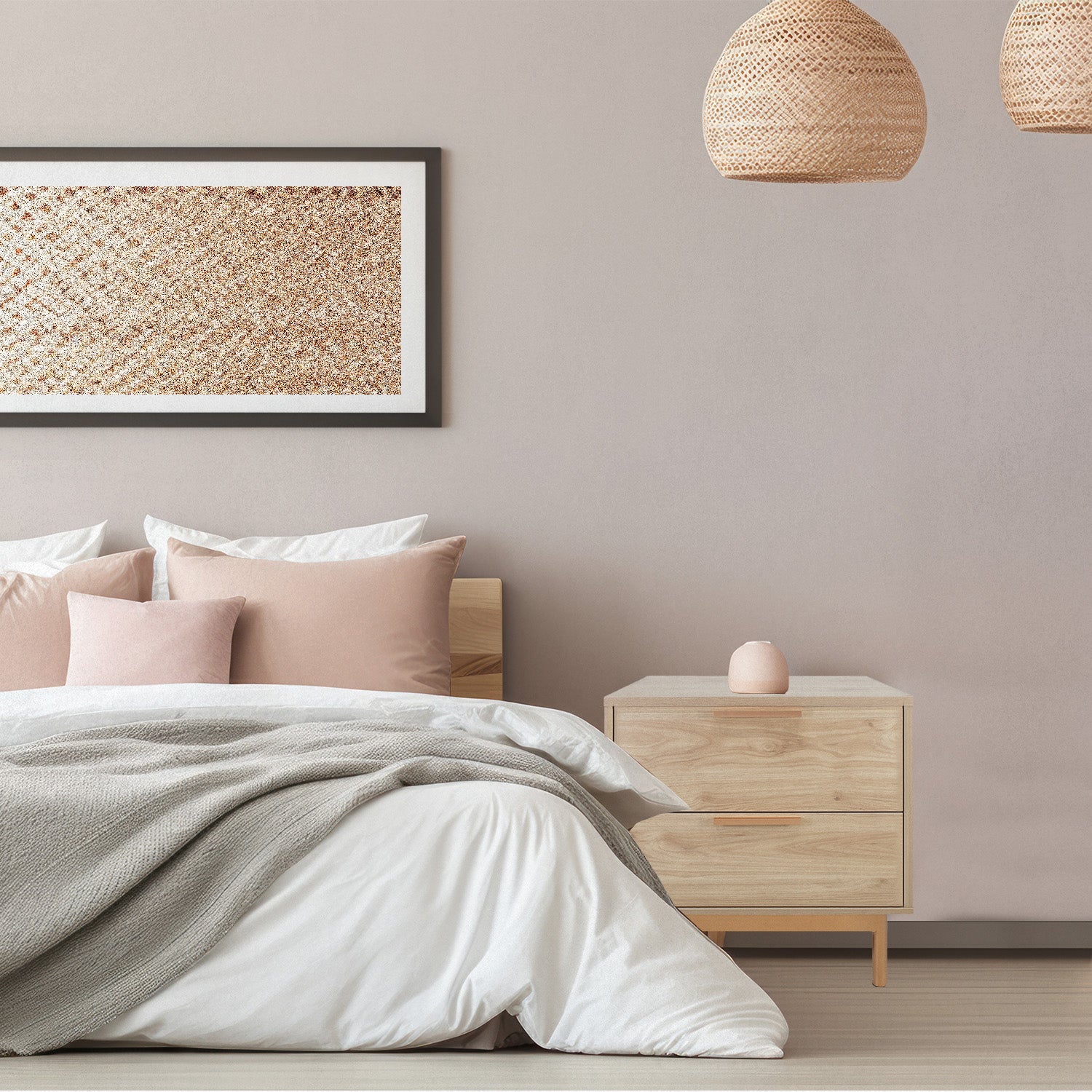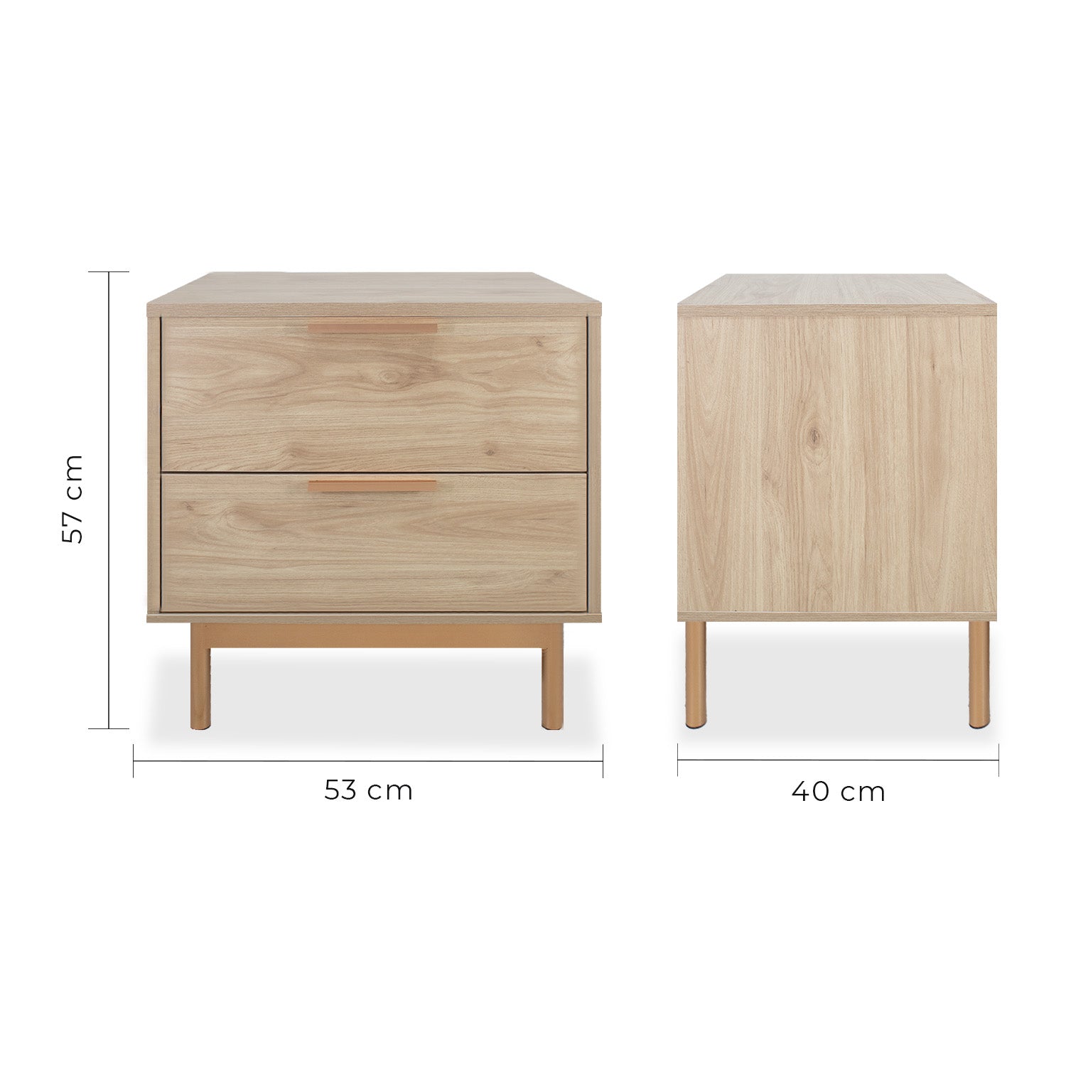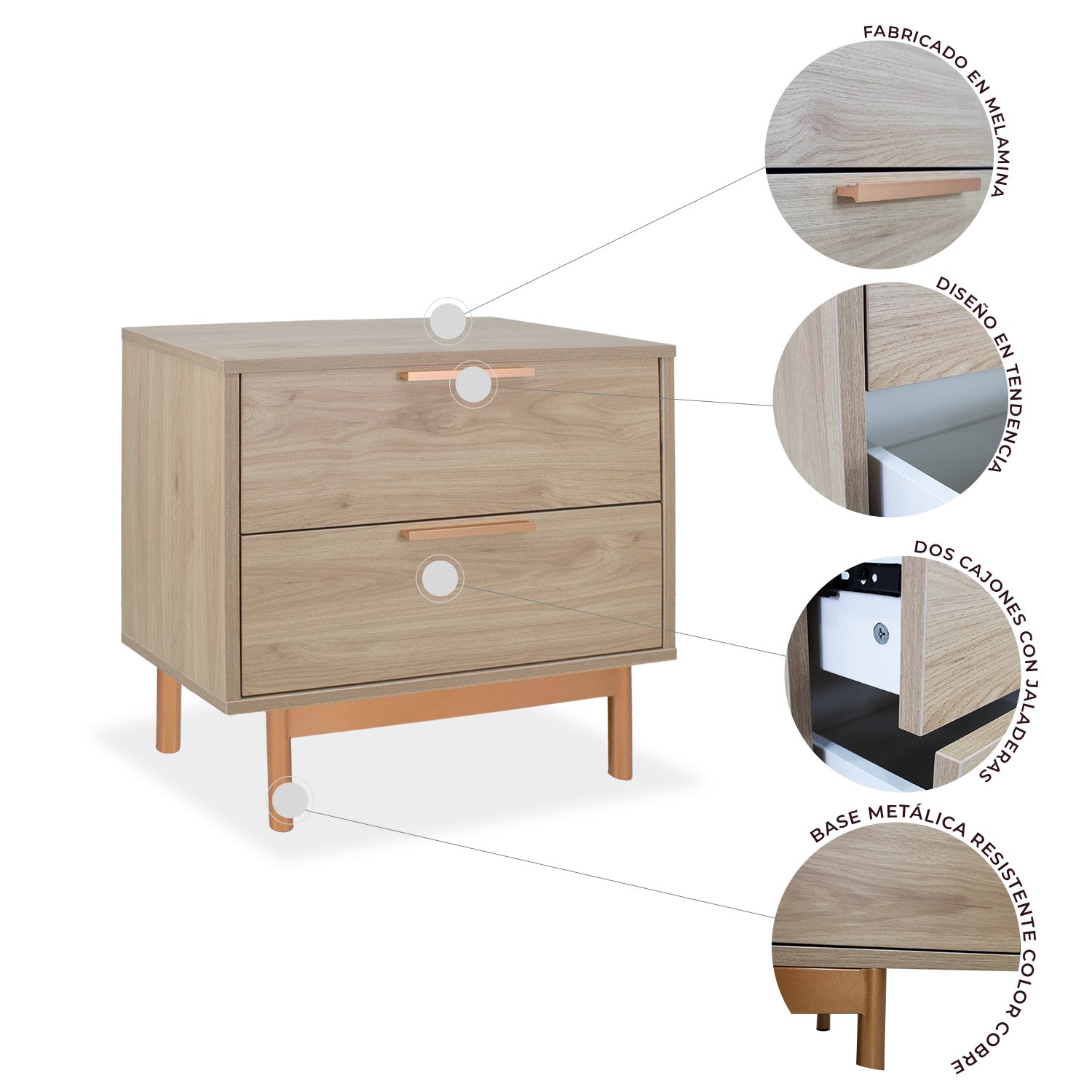 Fabricado en melamina, cuenta con 2 cajones multiusos con correderas de extensión y jaladeras color cobre. Base metálica resistente color cobre
