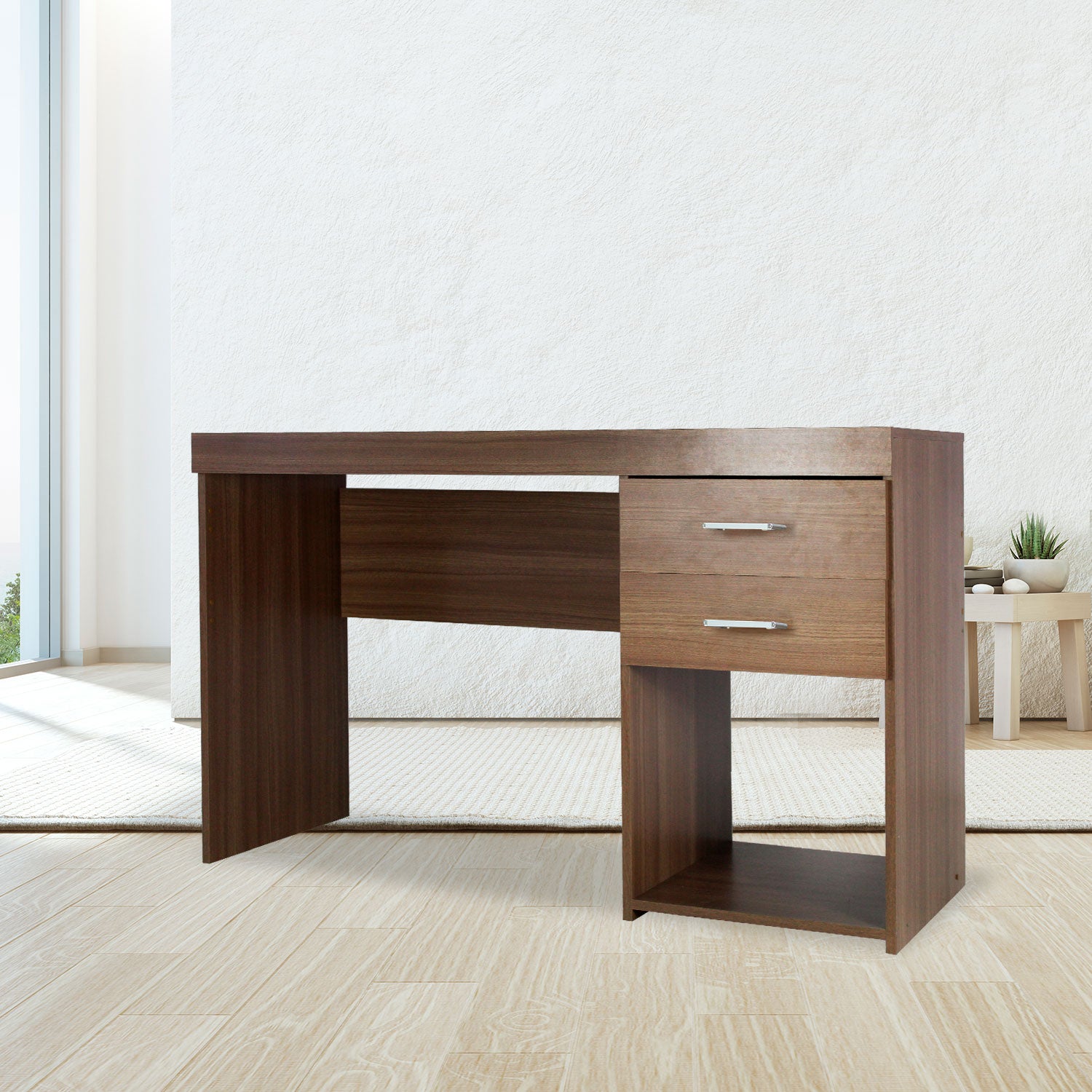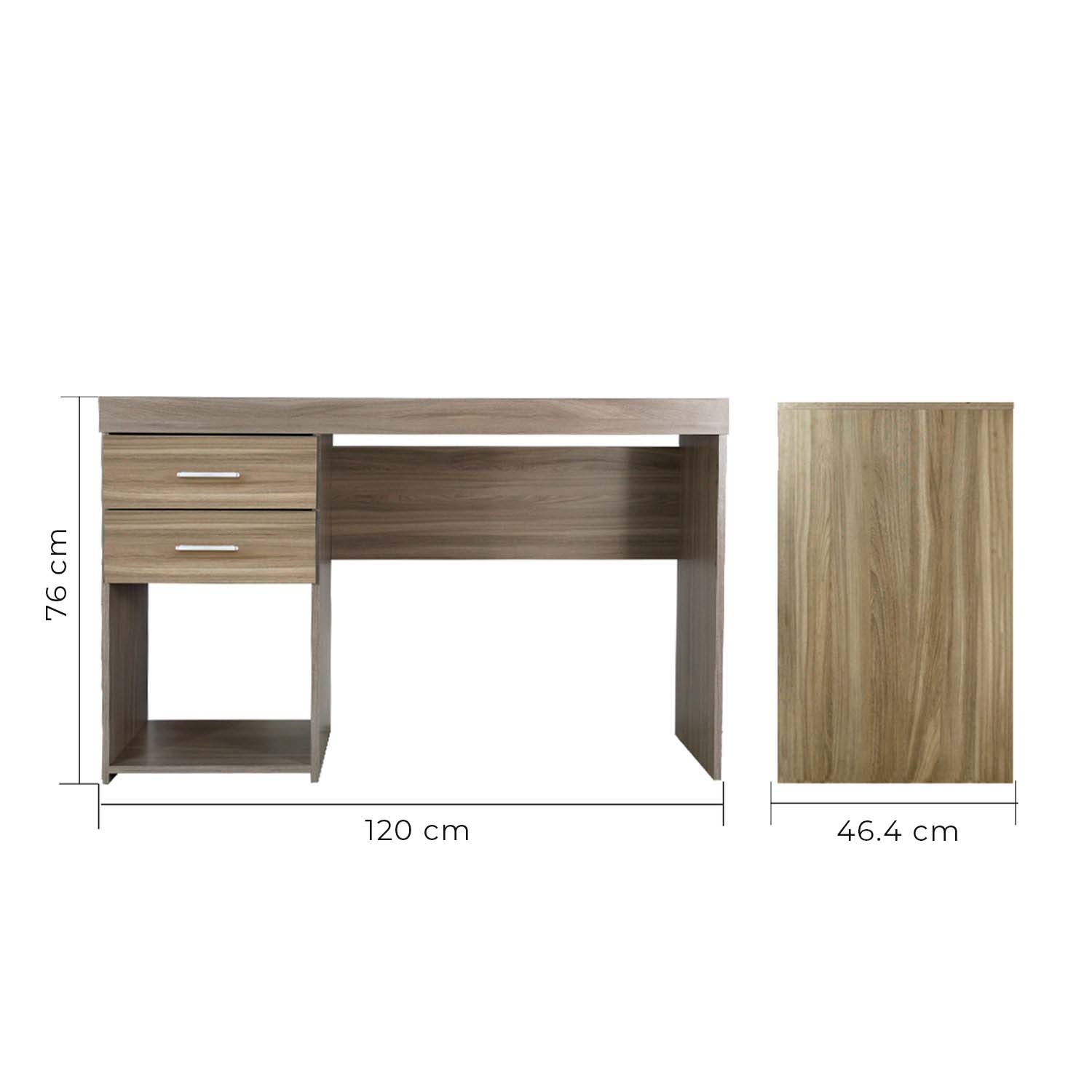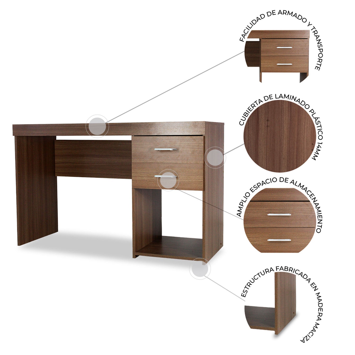 Fabricado en madera, cuenta con una amplio espacio de trabajo, dos cajones y un espacio de exhibición