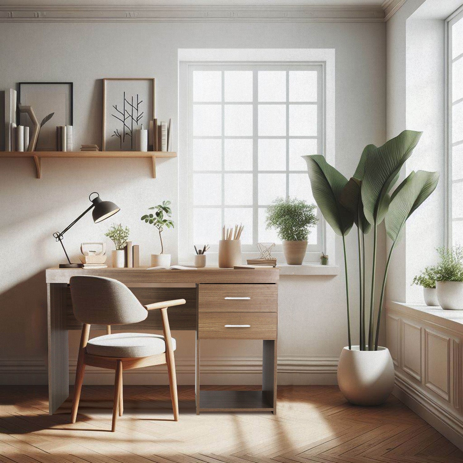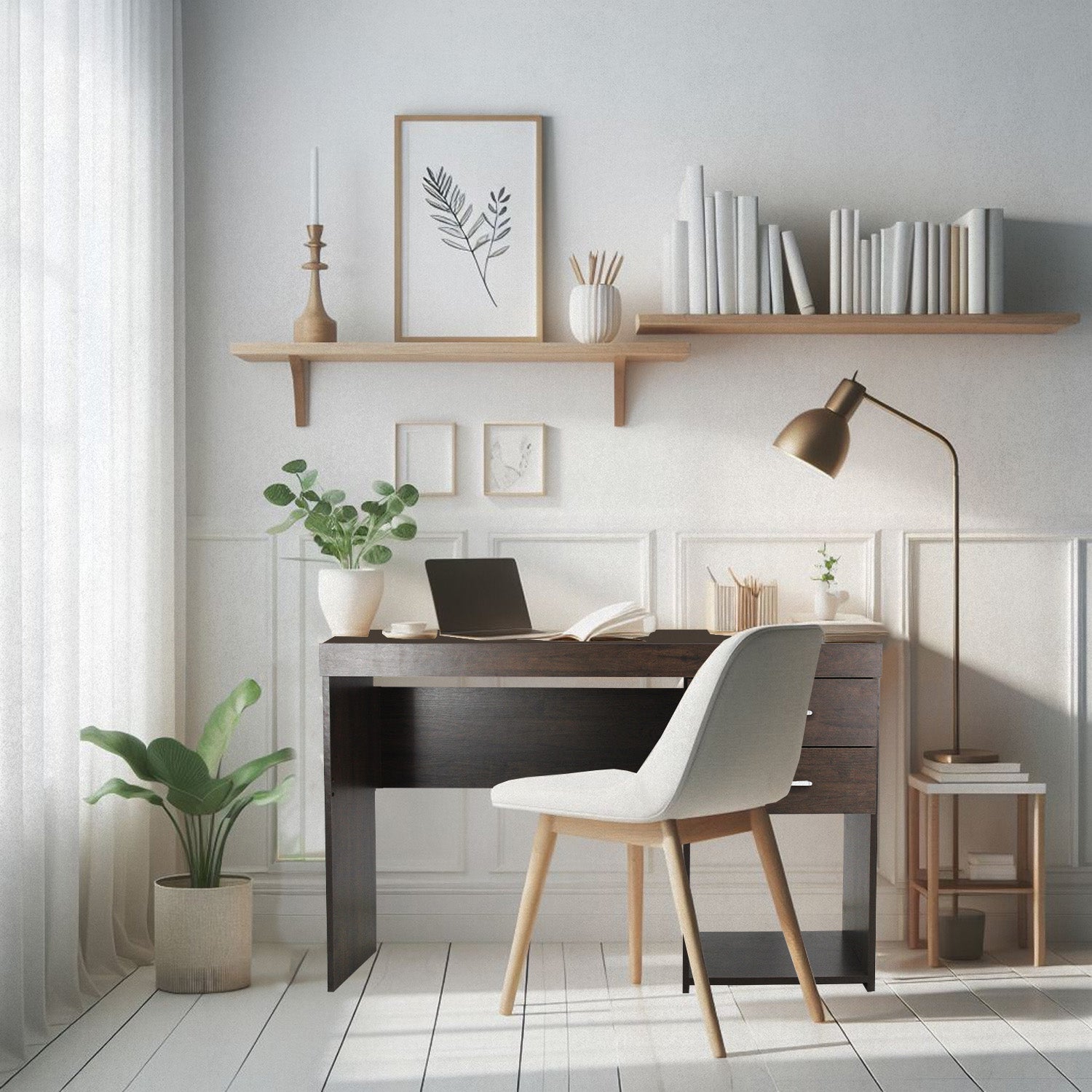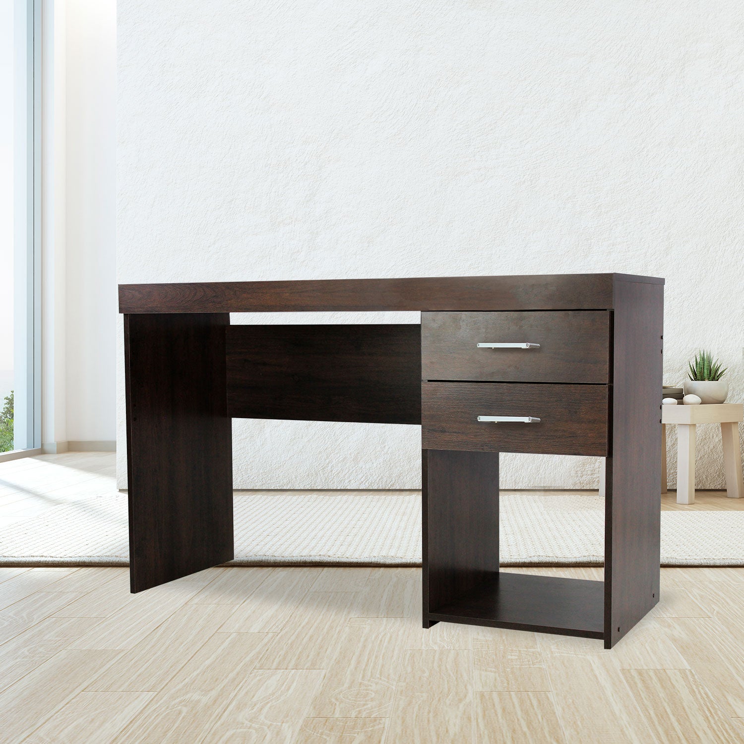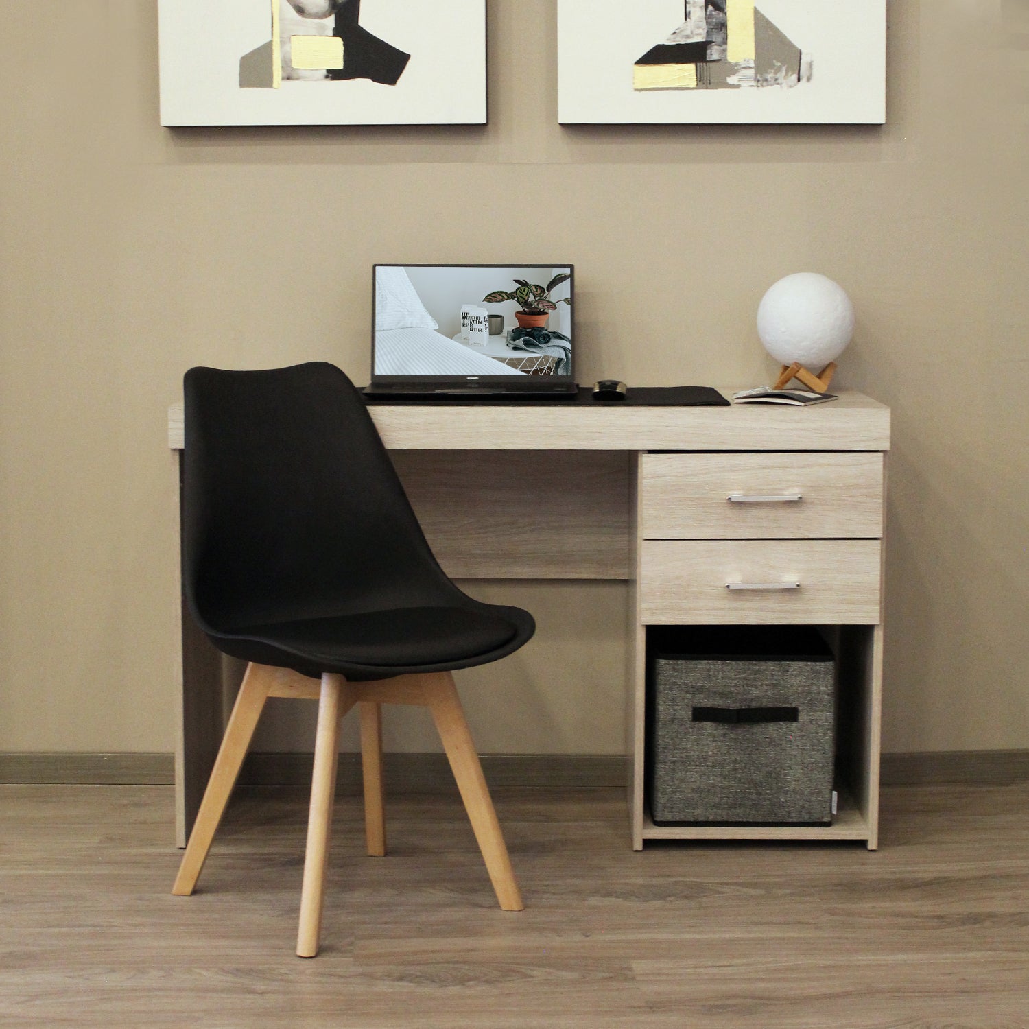 Fabricado en madera, cuenta con una amplio espacio de trabajo, dos cajones y un espacio de exhibición