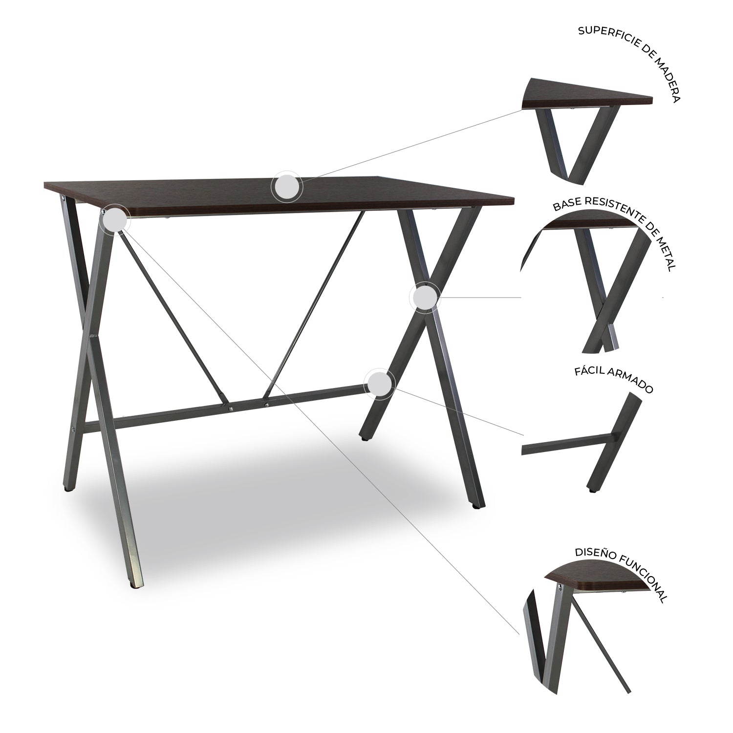 Fabricado en madera, cuenta con una estructura metálica