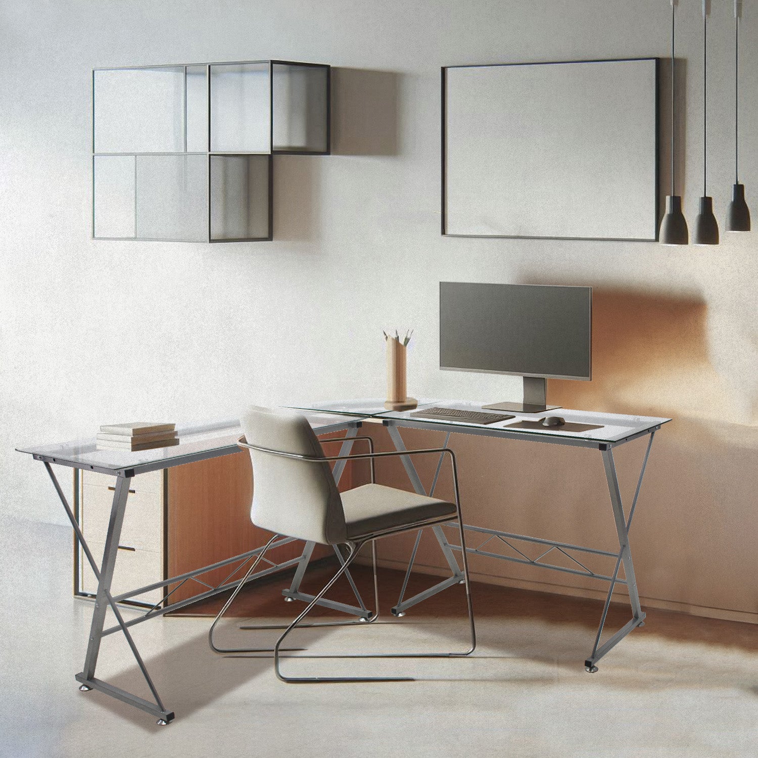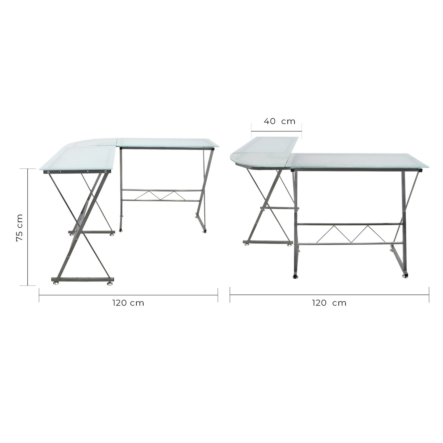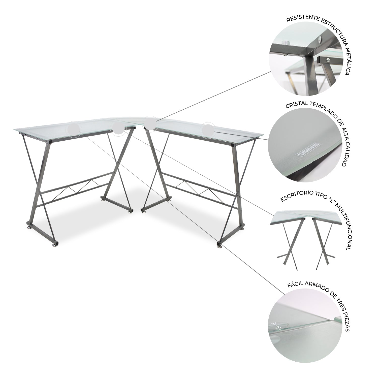 Fabricado en vidrio esmerilado o templado tipo “L”, cuenta con una estructura metálica