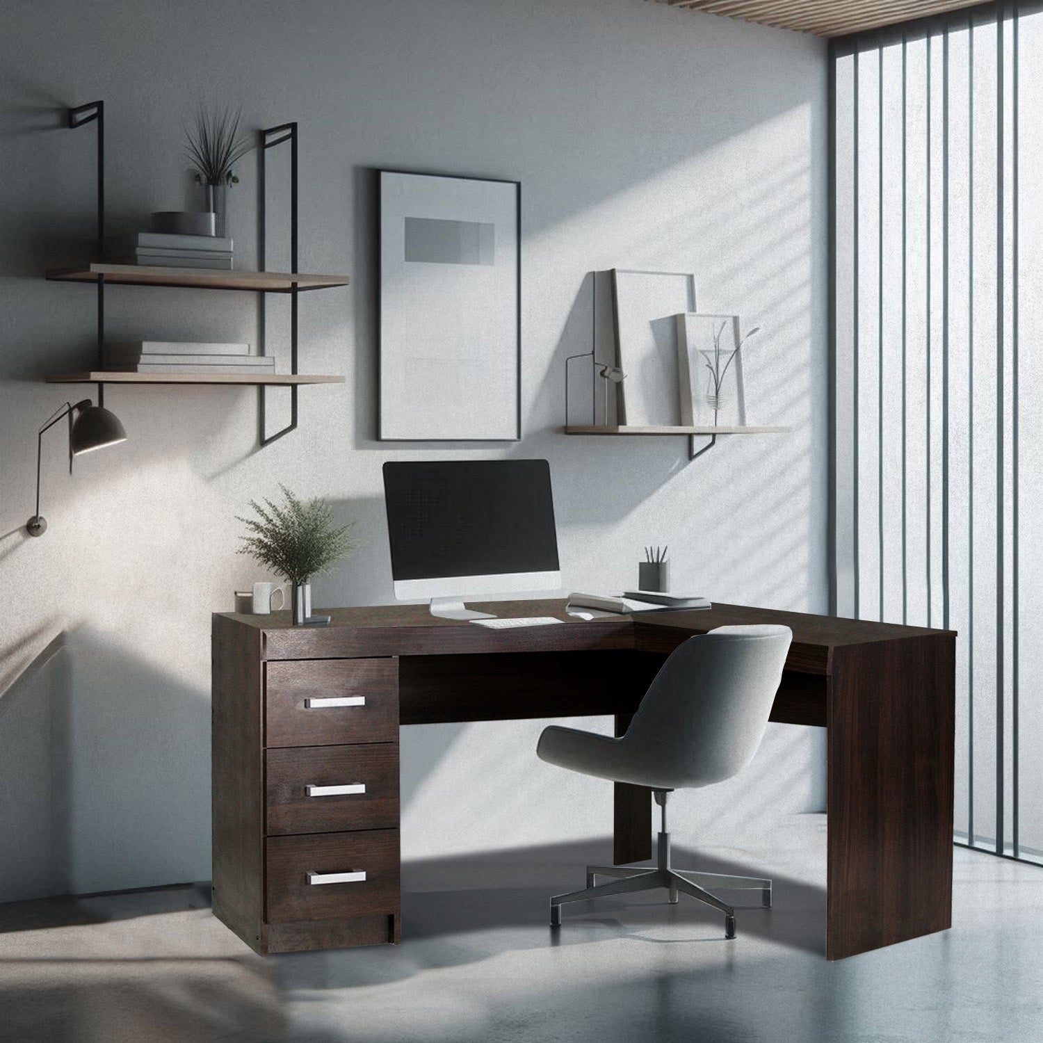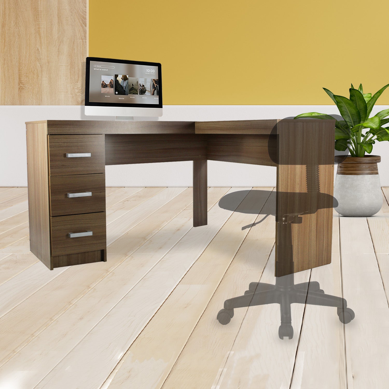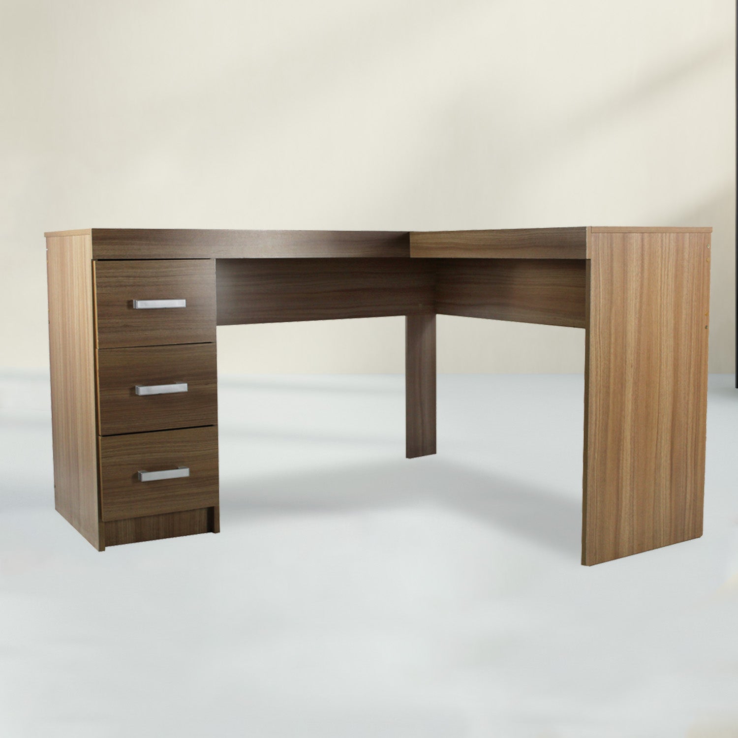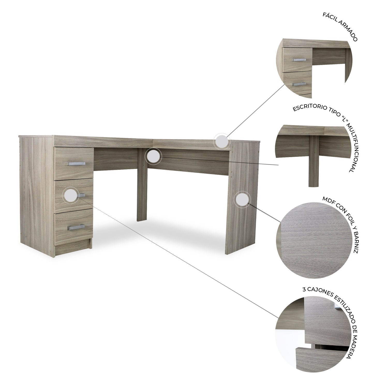 Fabricado en madera, cuenta con una amplio espacio de trabajo tipo “L” y tres cajones