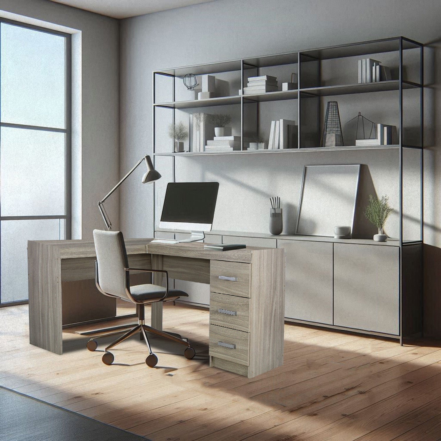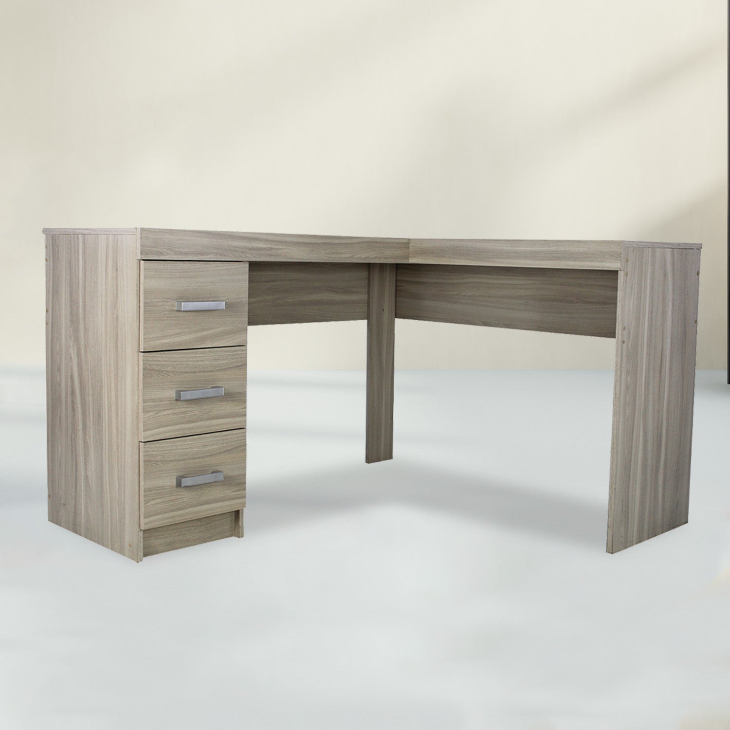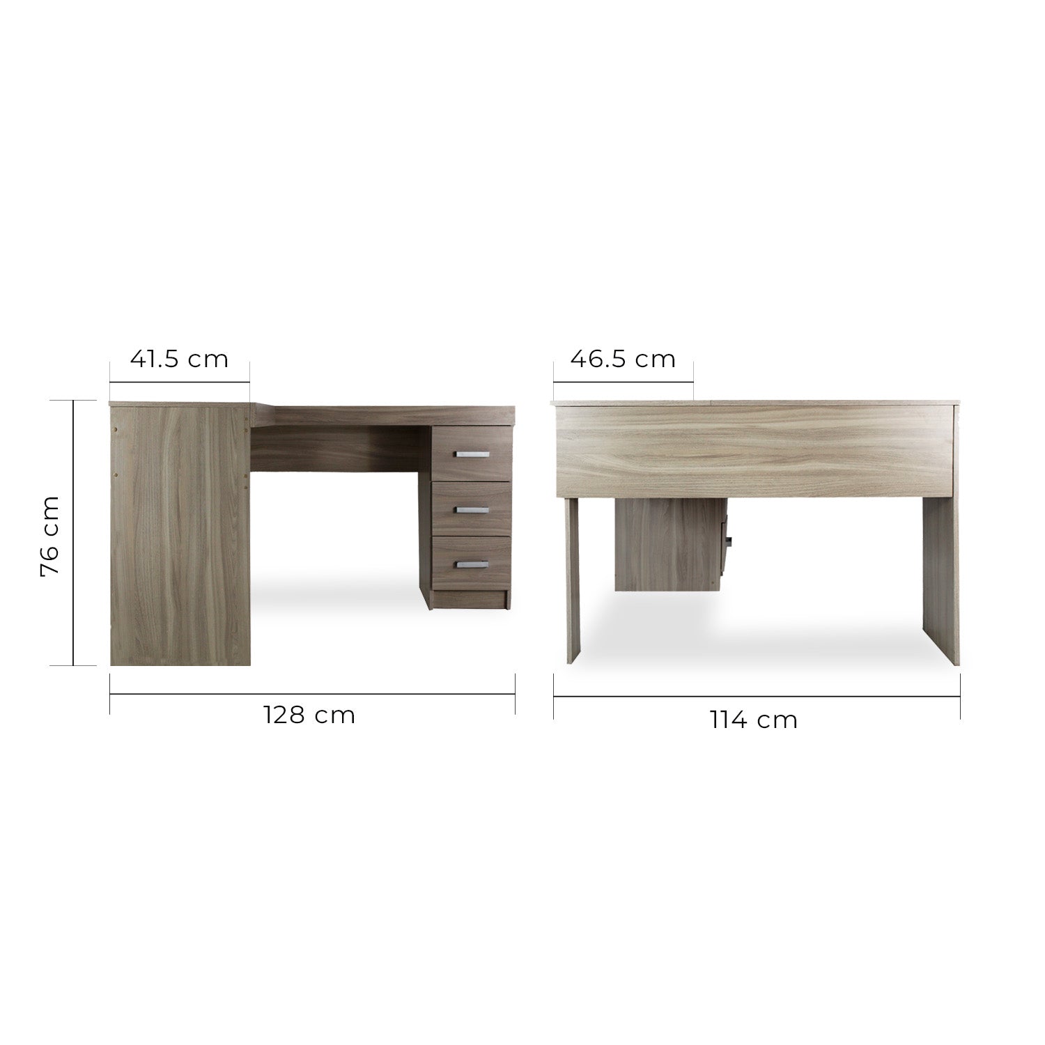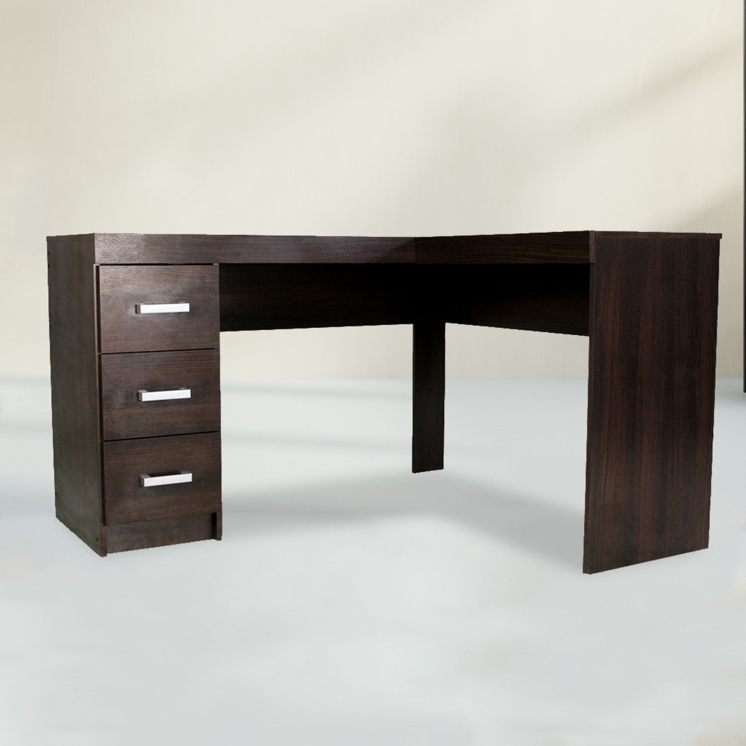 Fabricado en madera, cuenta con una amplio espacio de trabajo tipo “L” y tres cajones