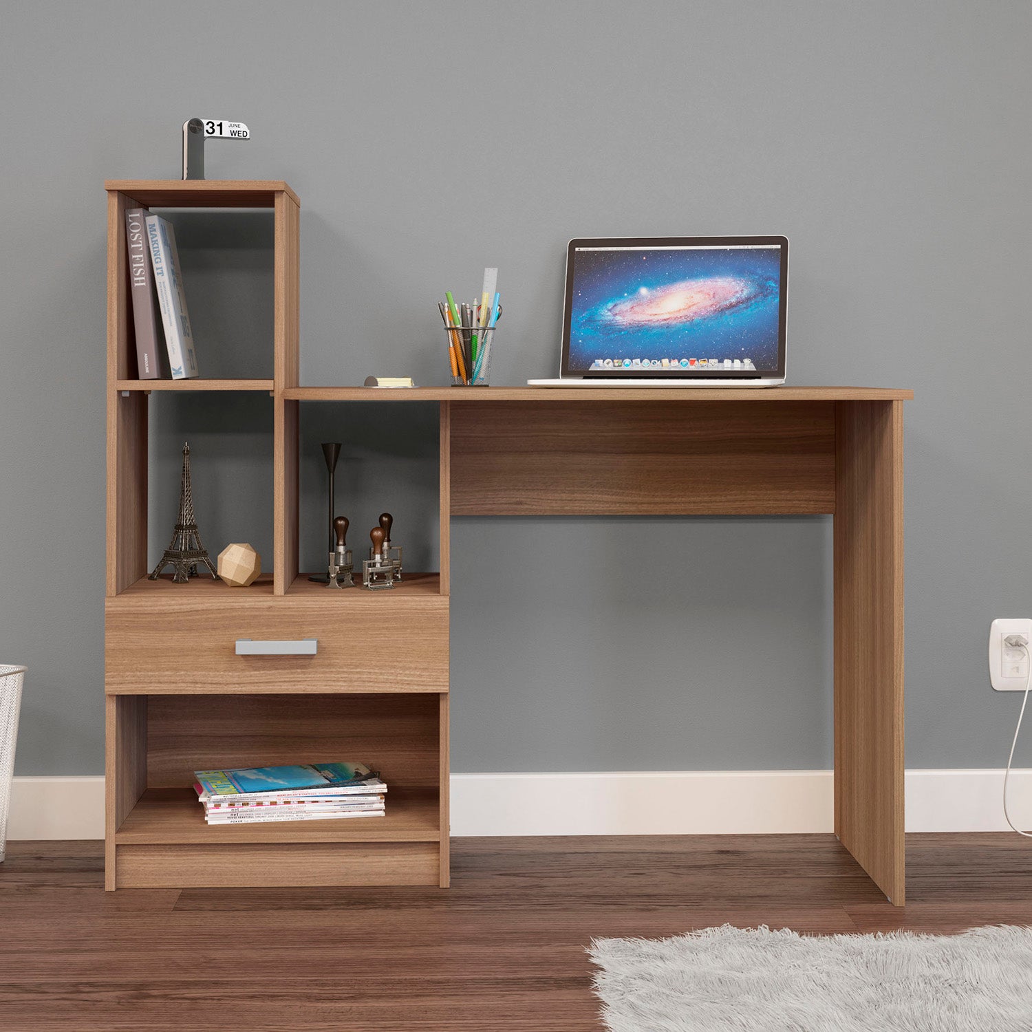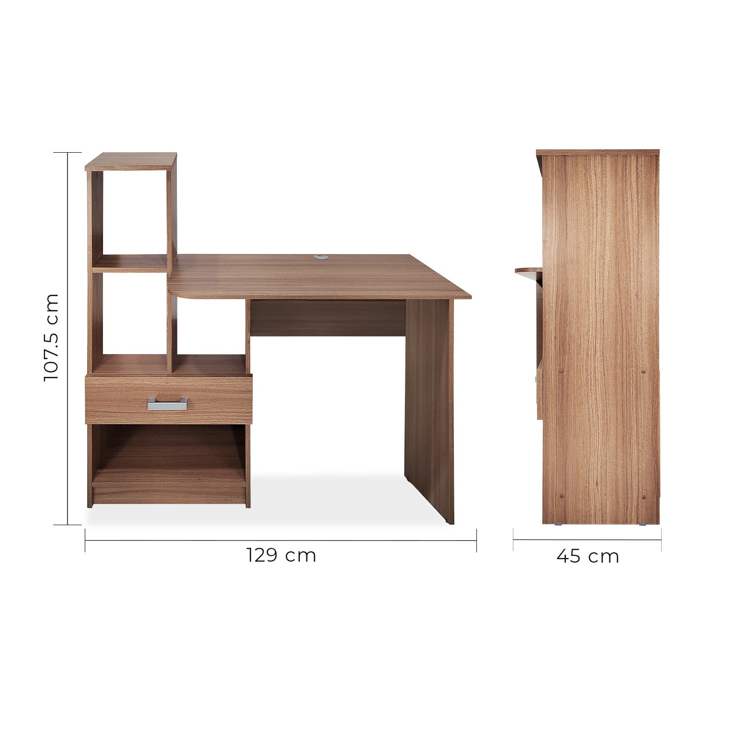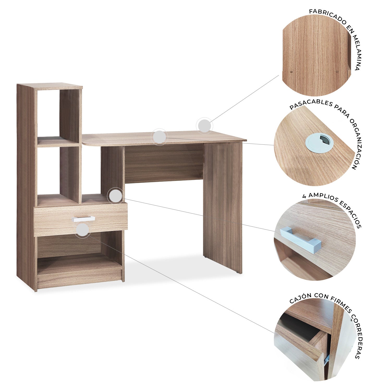 Fabricado en madera, cuenta con un amplio espacio de trabajo, cajón y cuatro compartimentos extras