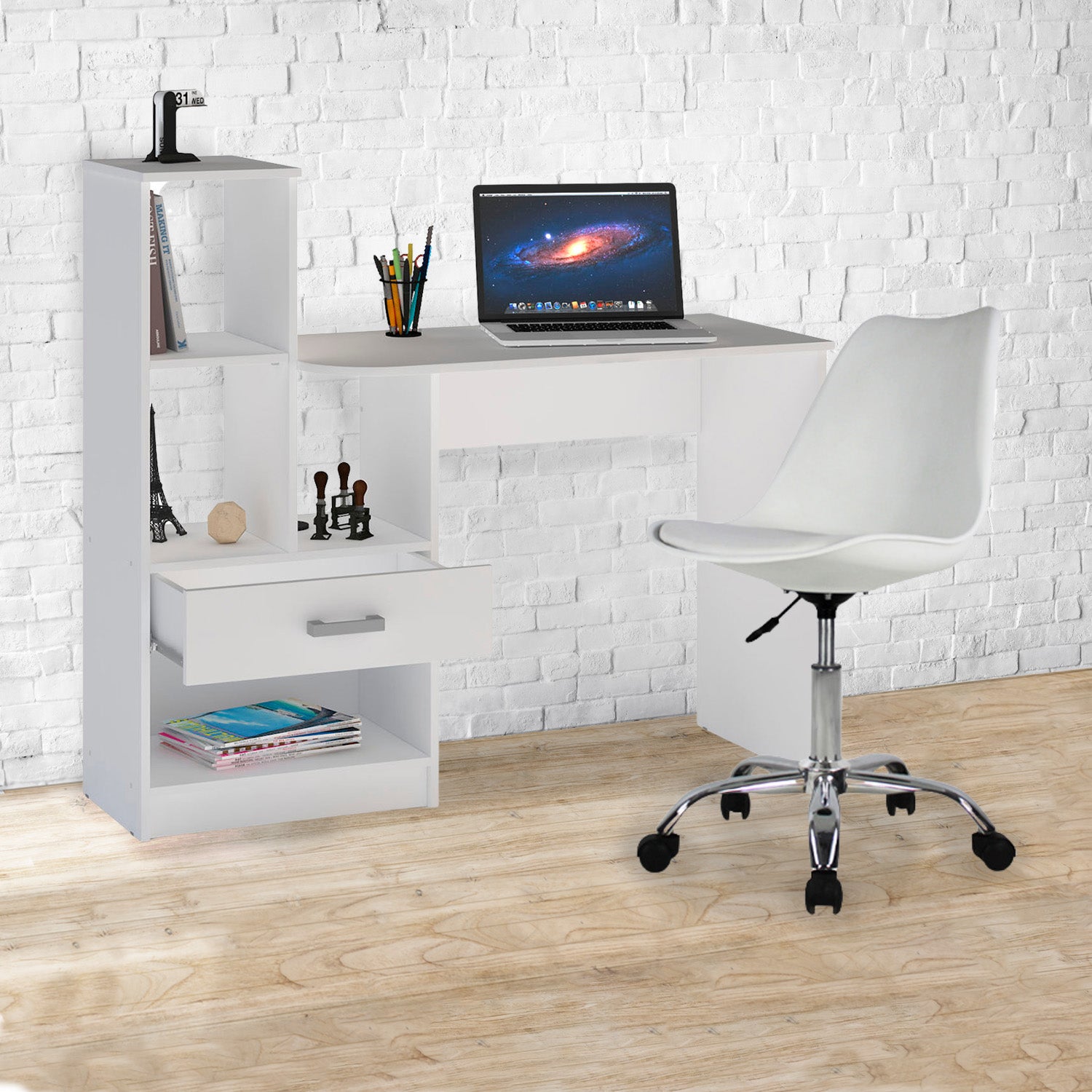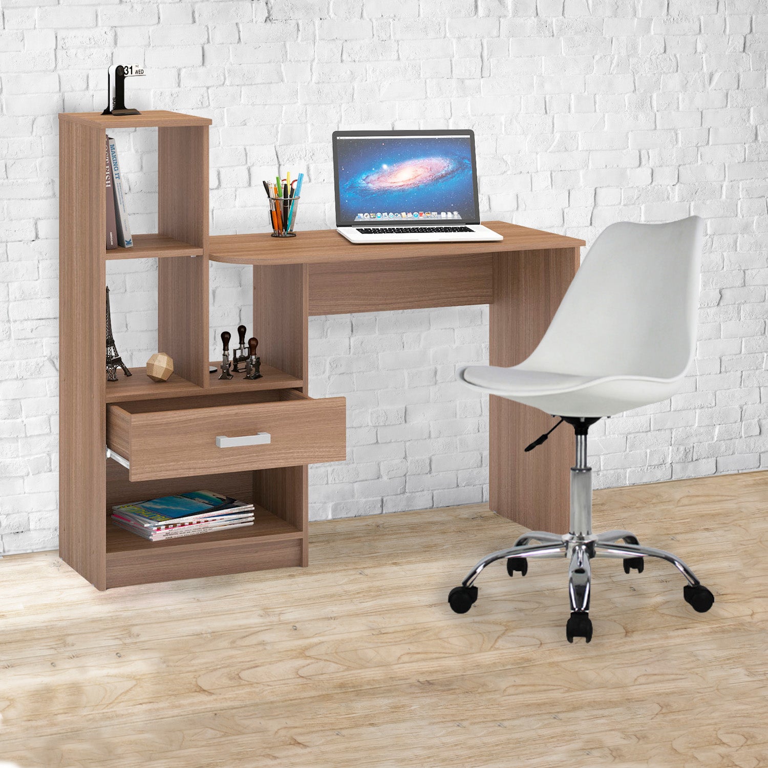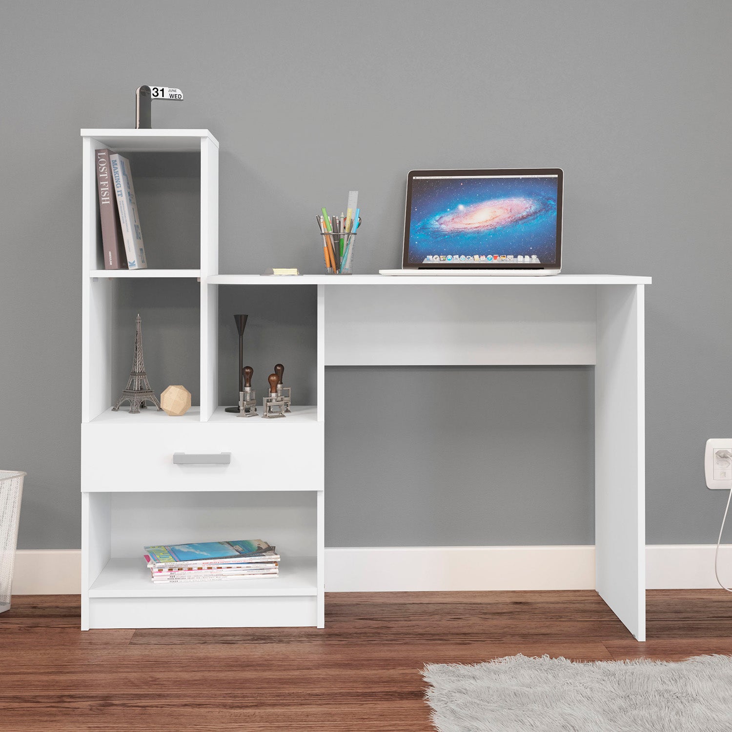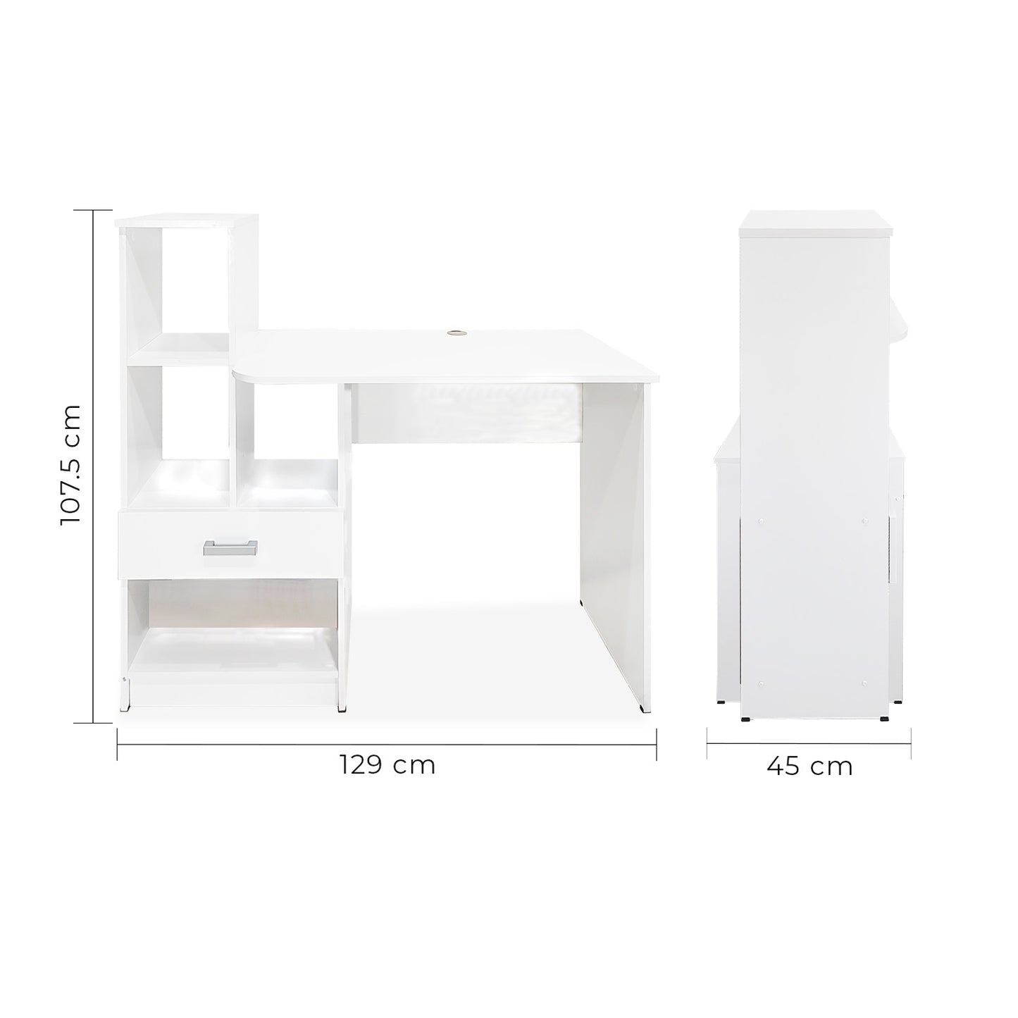 Fabricado en madera, cuenta con un amplio espacio de trabajo, cajón y cuatro compartimentos extras