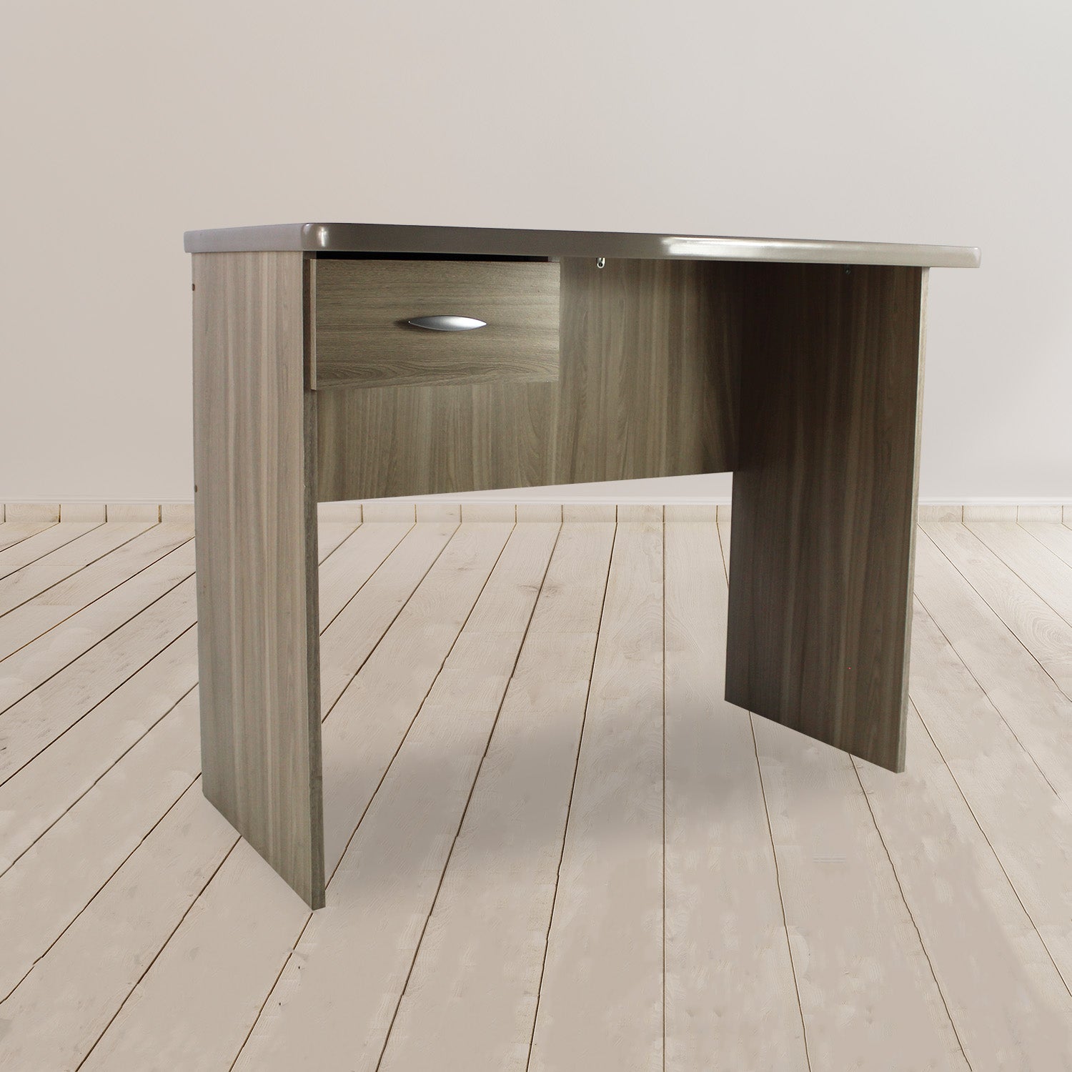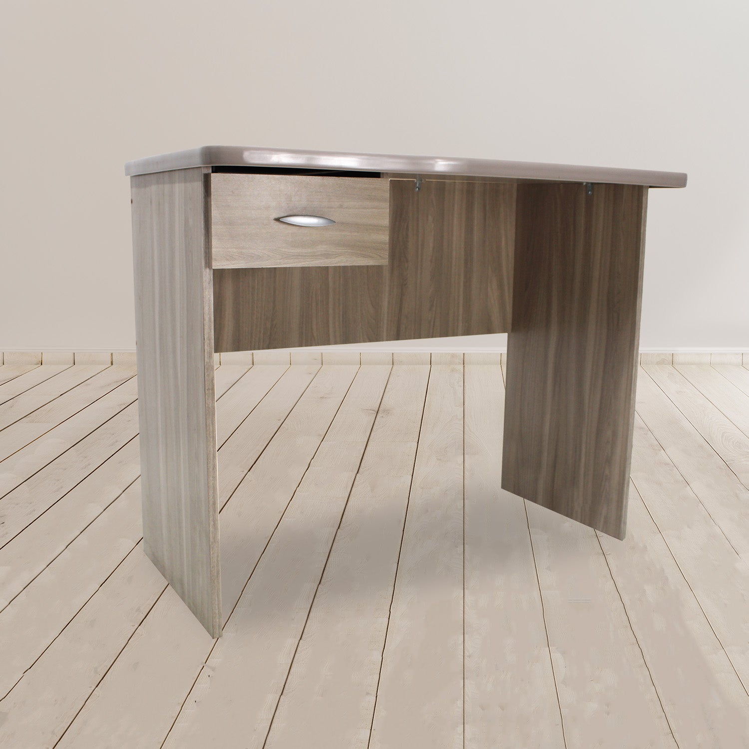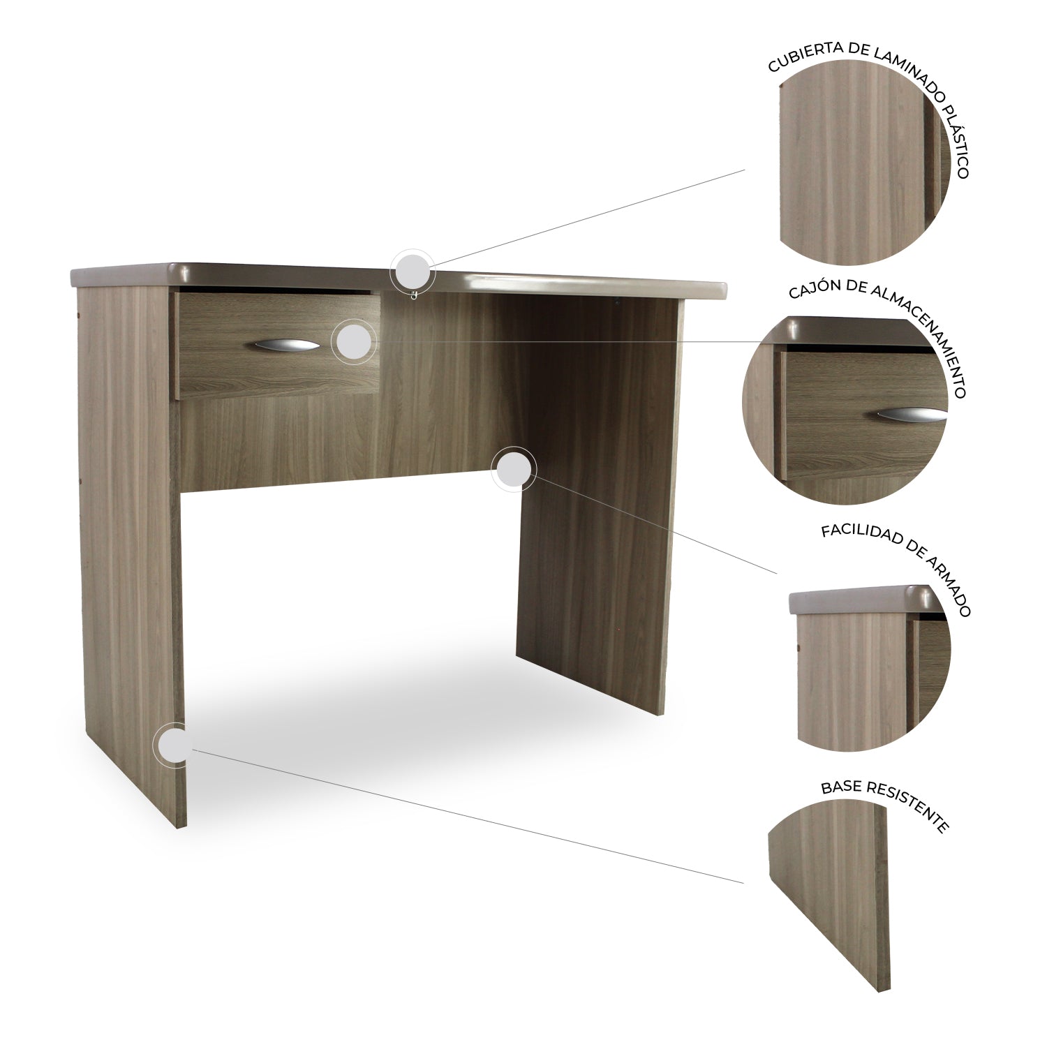 Fabricado en madera, cuenta con bordes redondeados en su espacio de trabajo, detallado con un marco de hule, y una área de almacenamiento tipo cajón