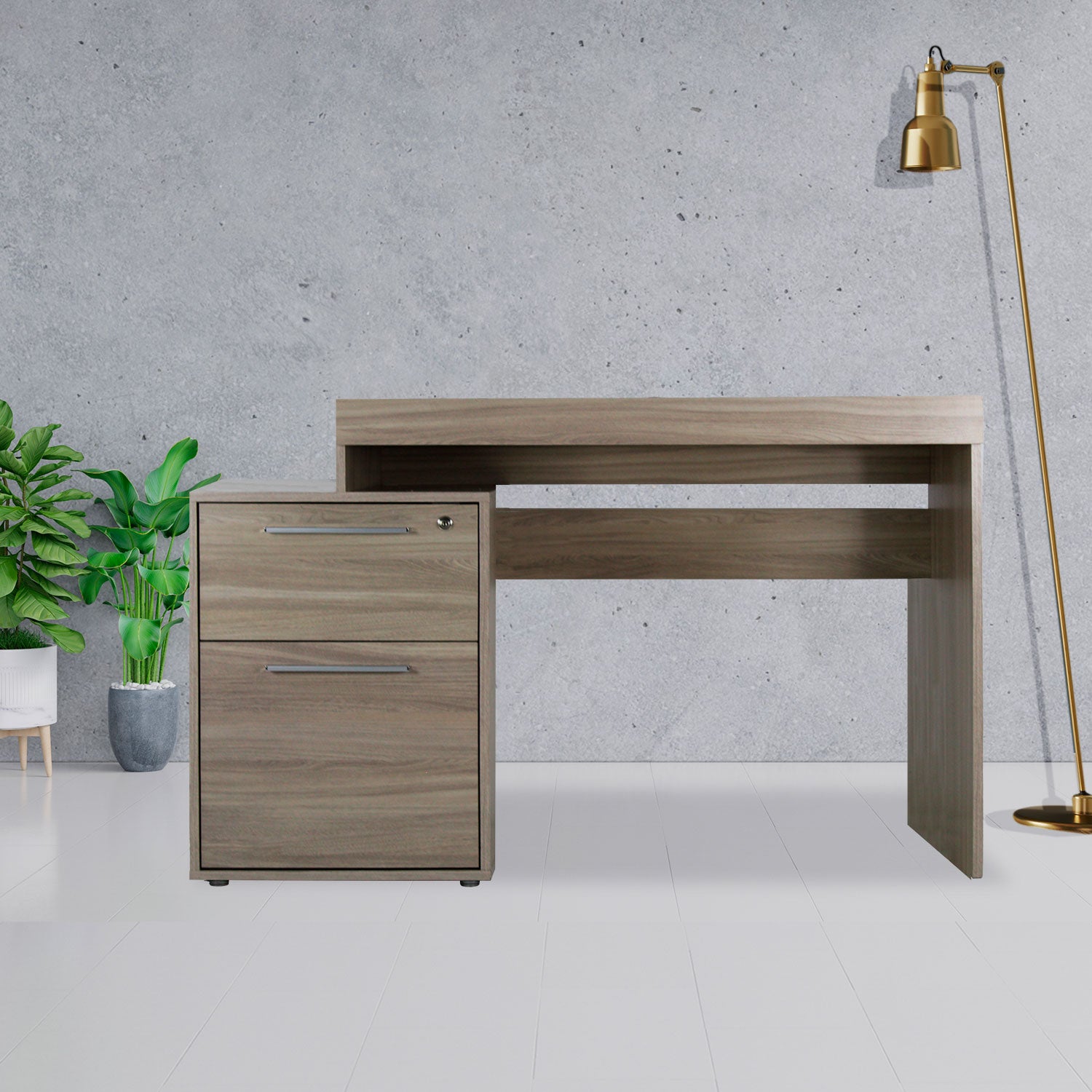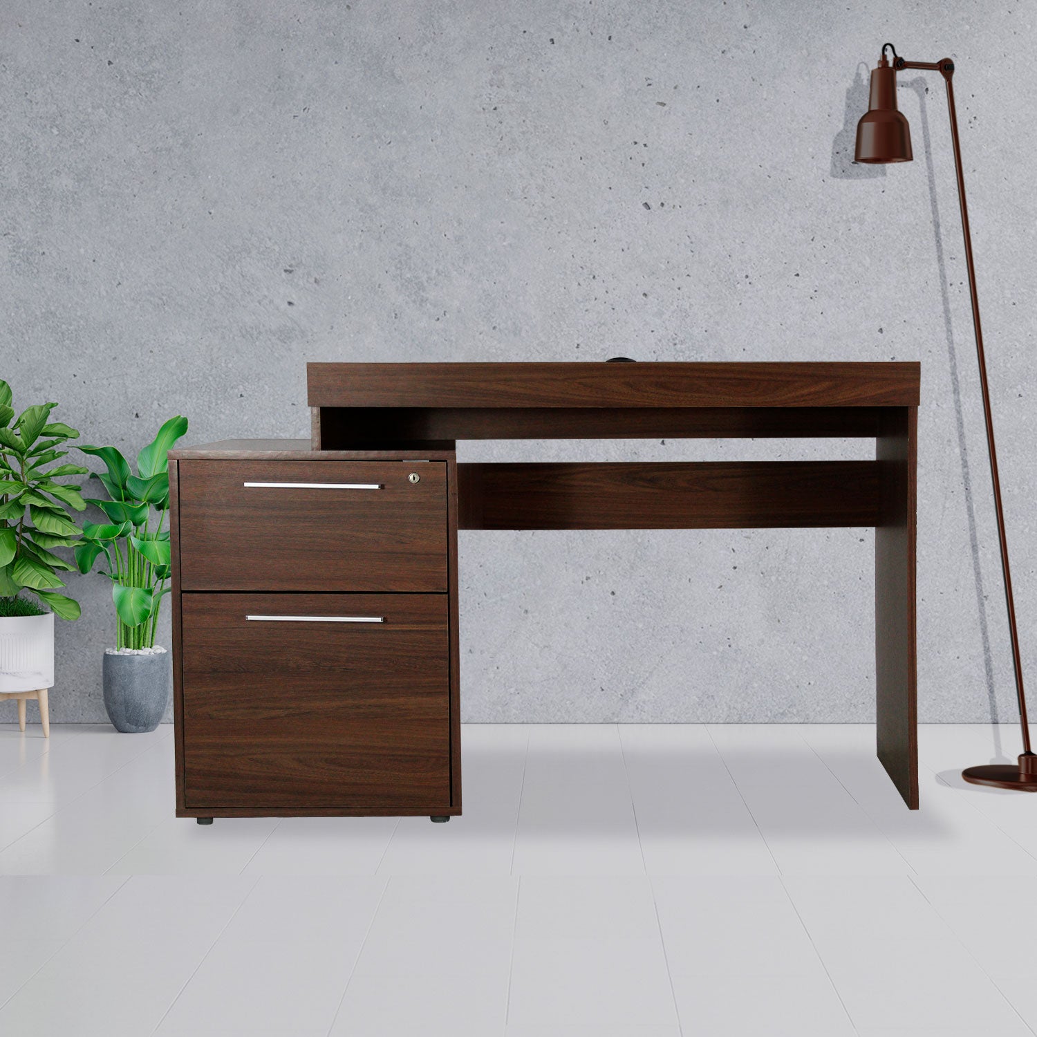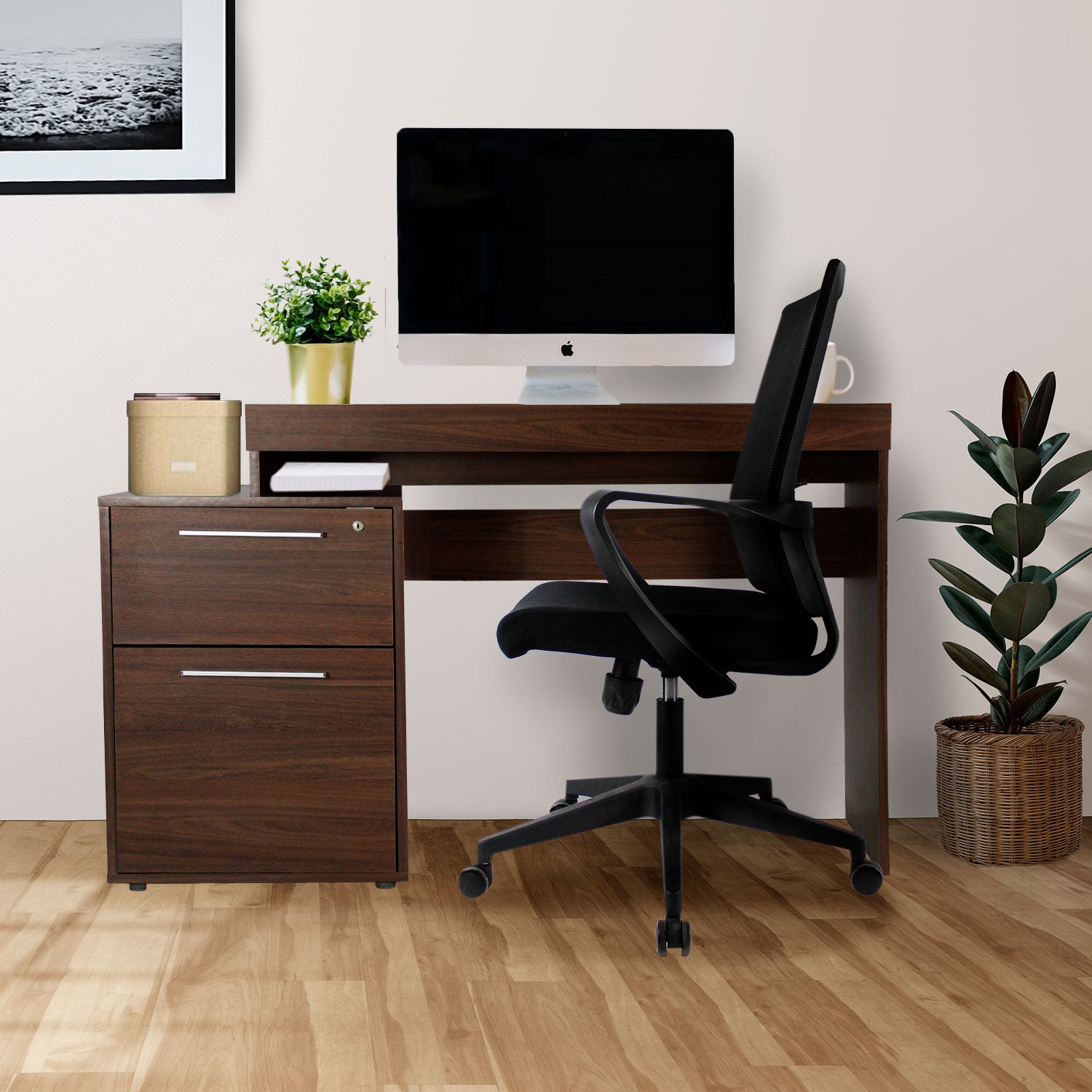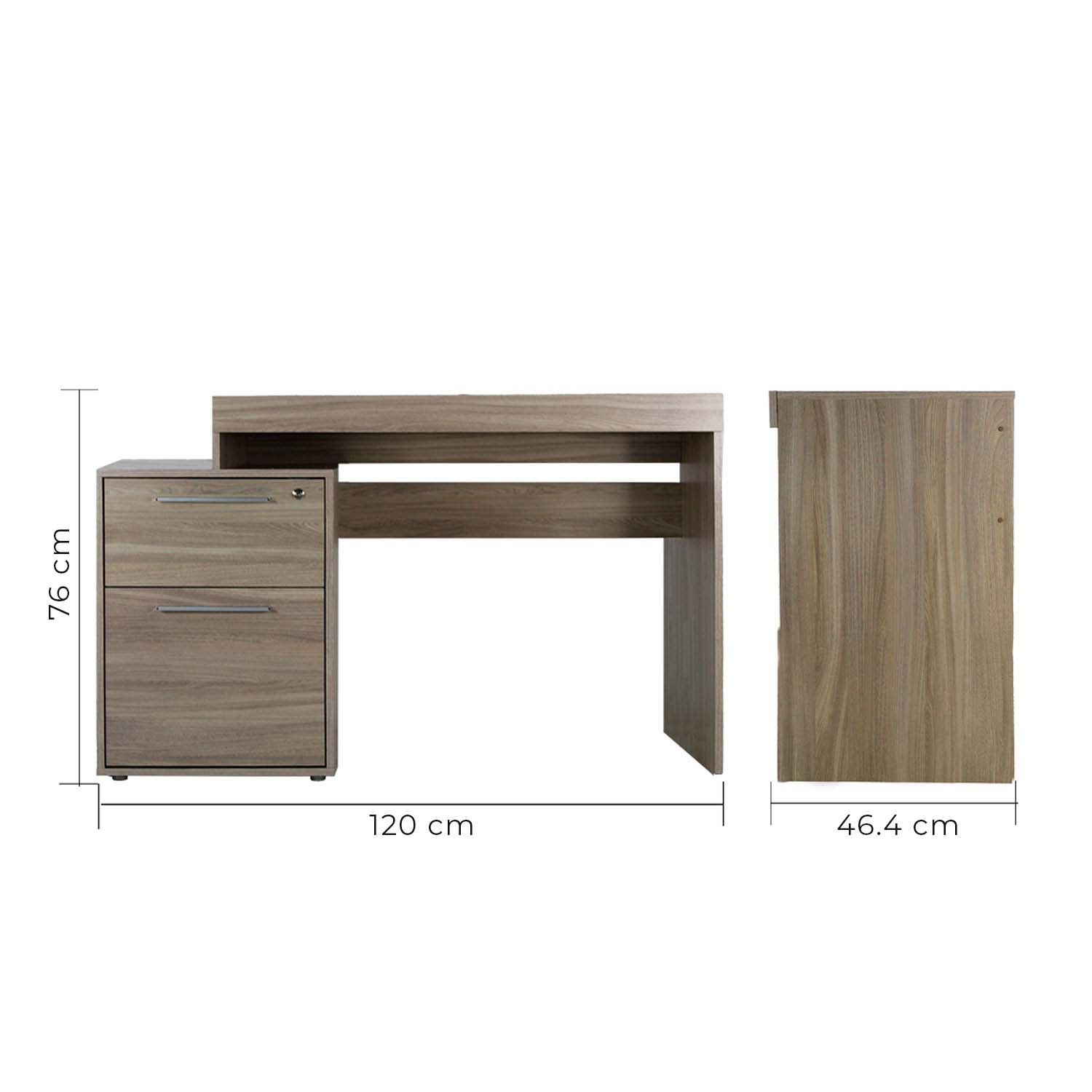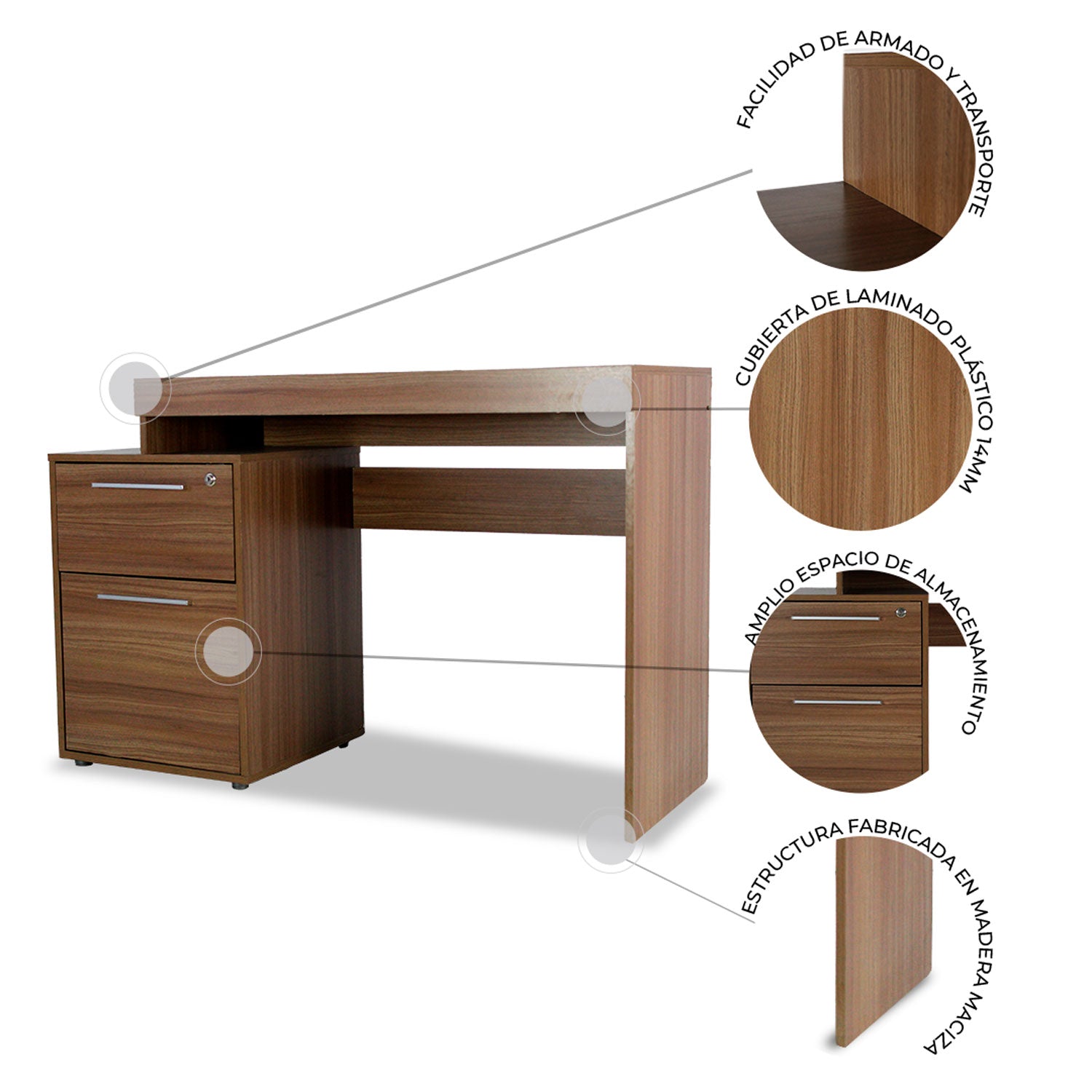 Fabricado en madera, cuenta con una amplio espacio de trabajo con dos cajones