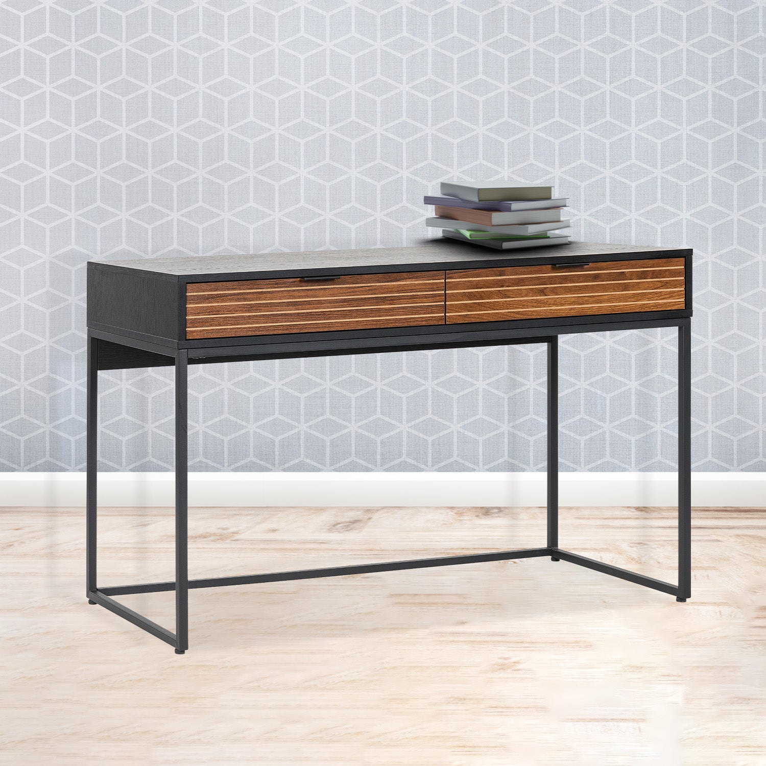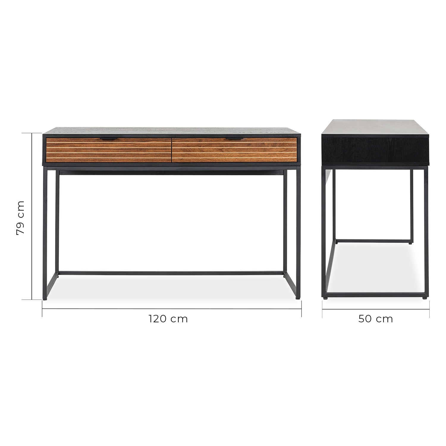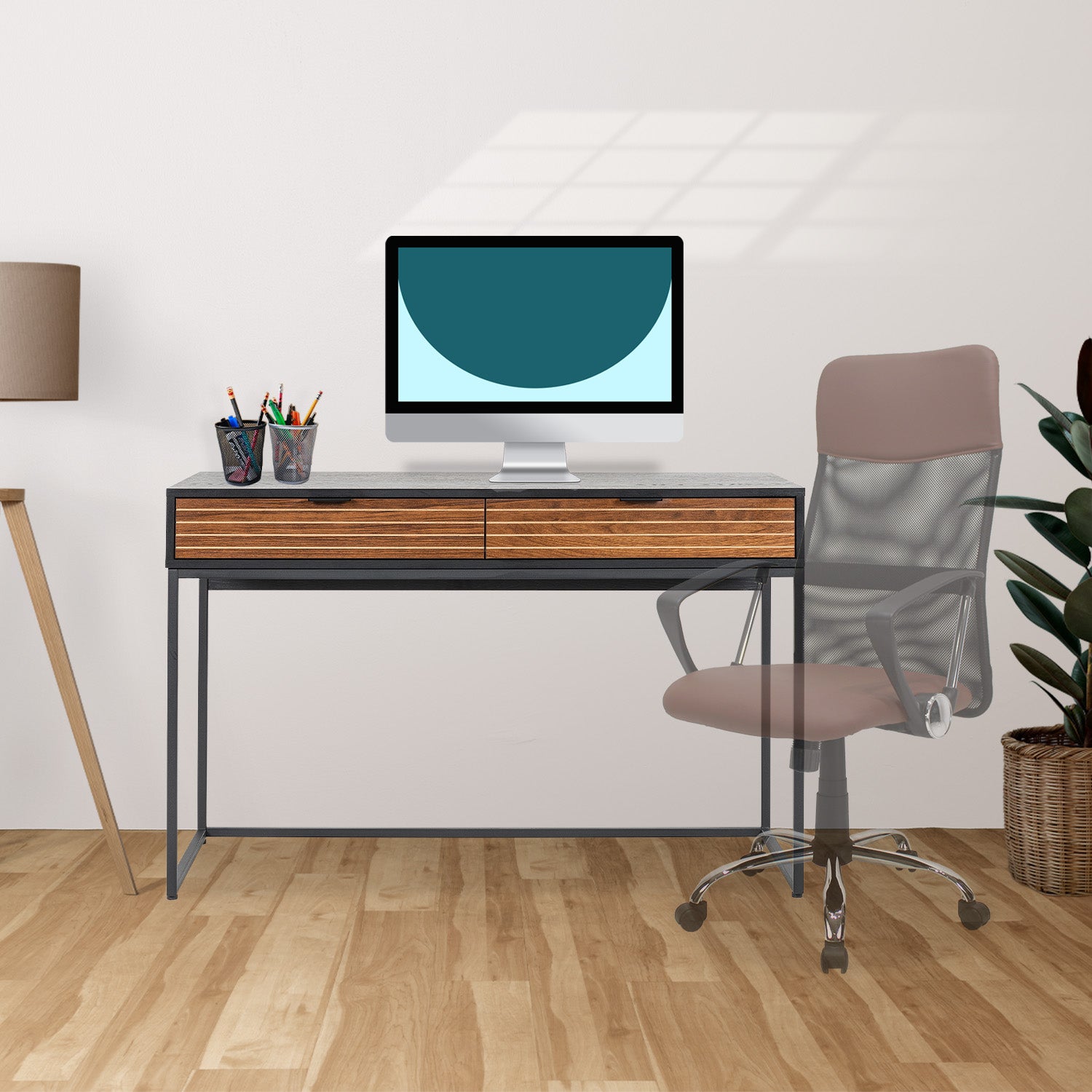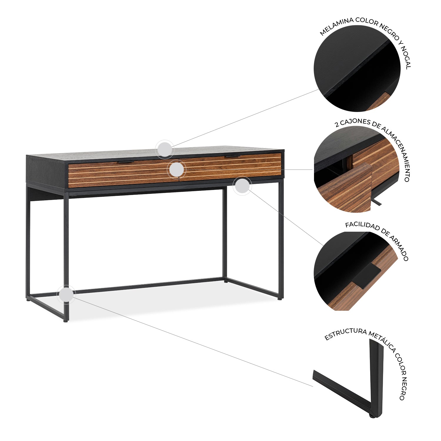 Fabricado en melamina con estructura metálica. Cuenta con 2 cajones