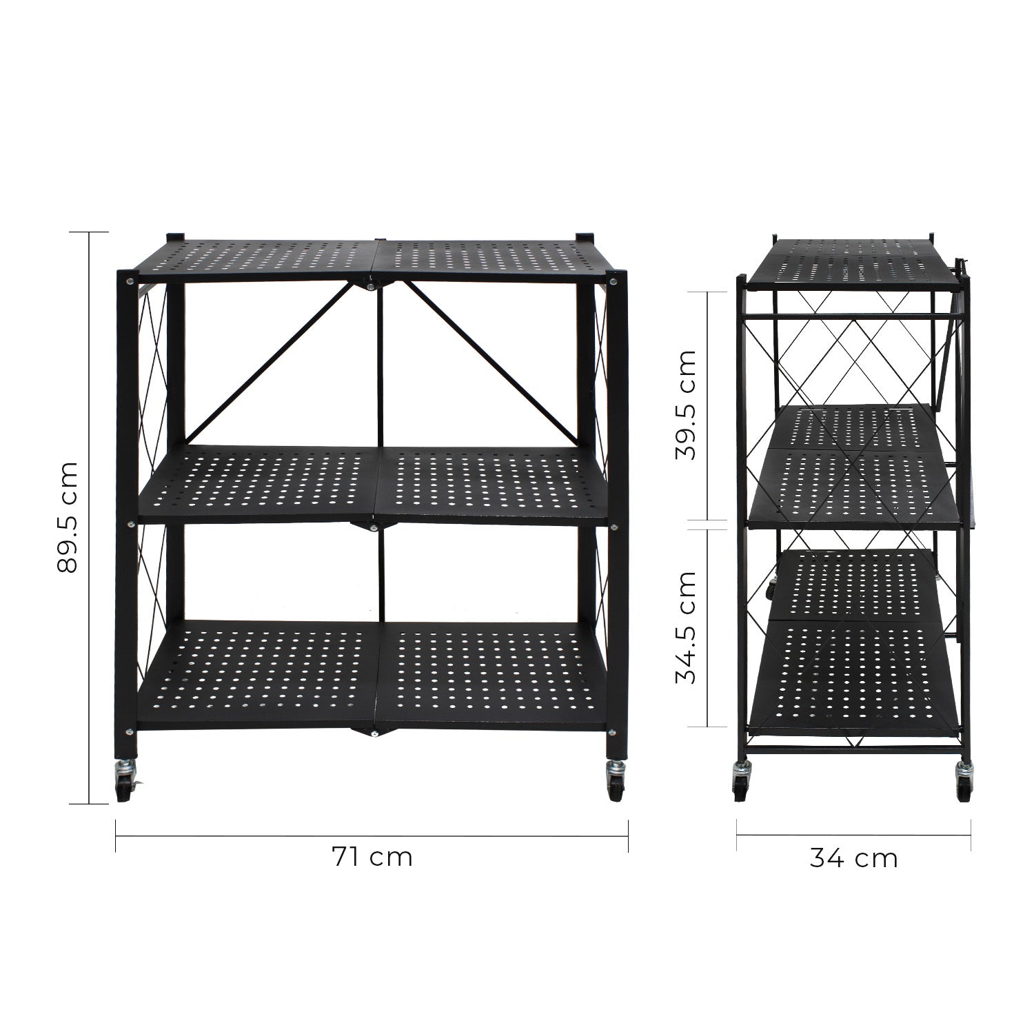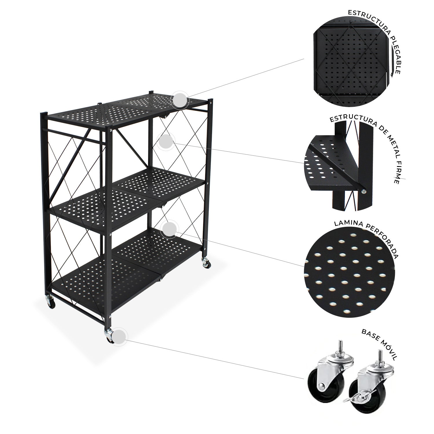 Estructura metálica firme, cuenta con 3 repisas de lamina perforada y base móvil