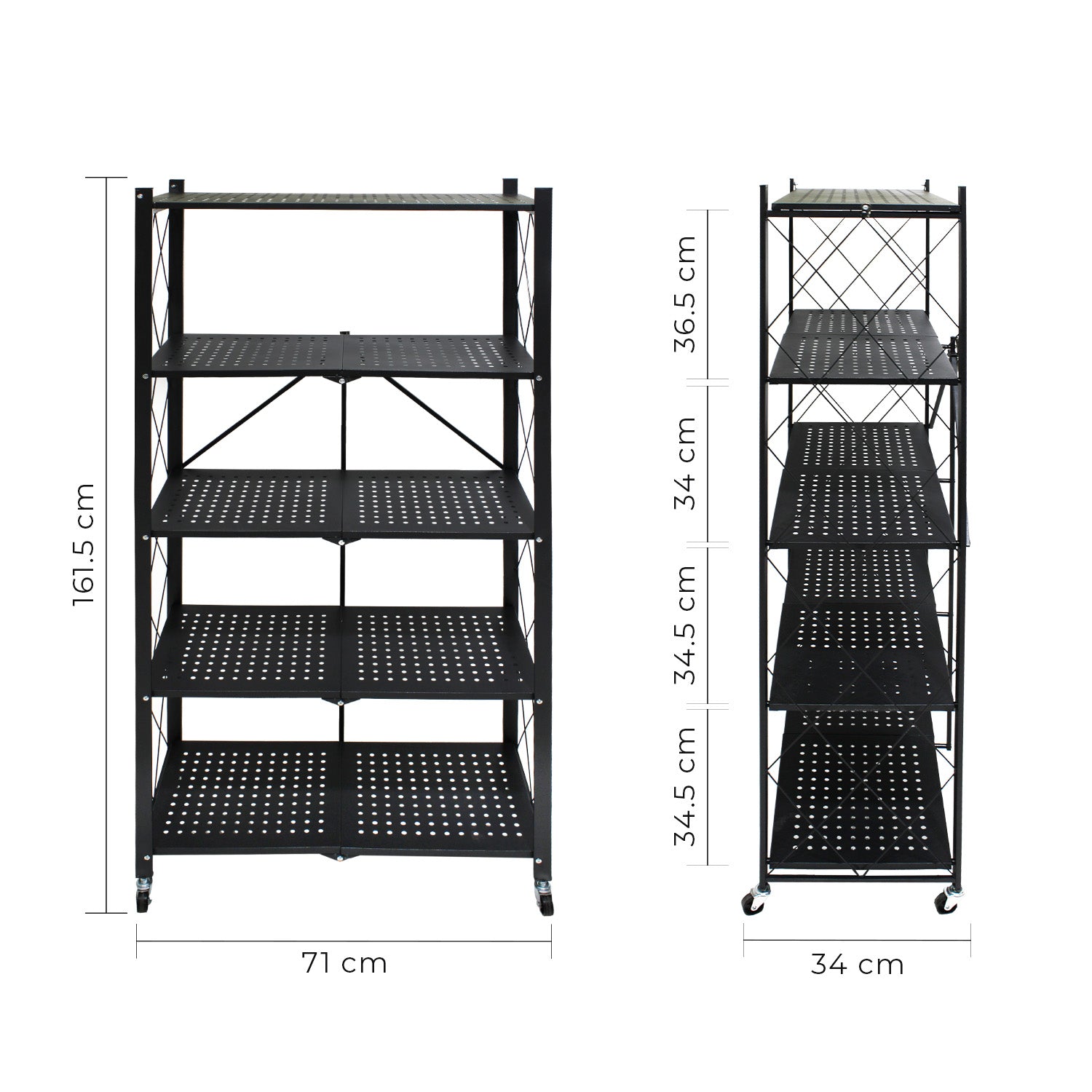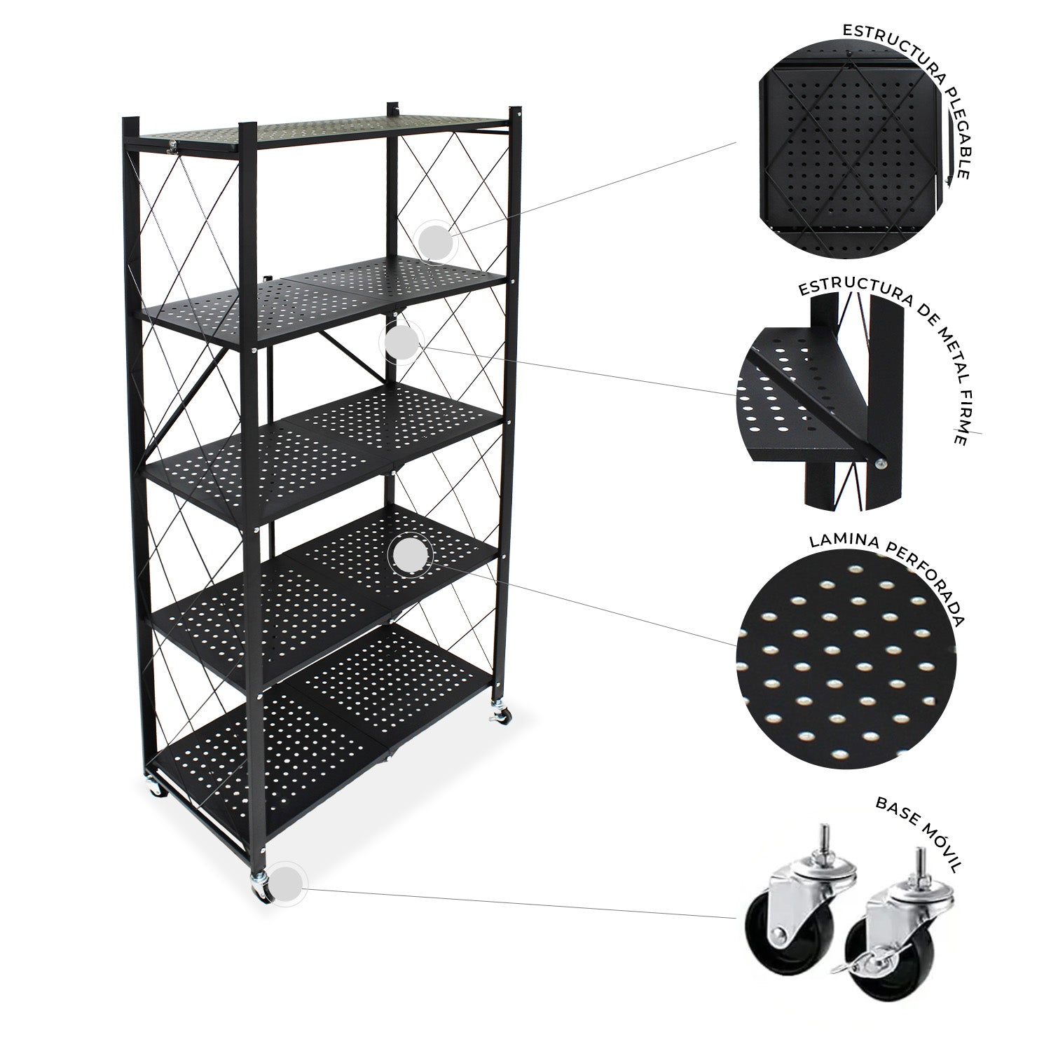 Estructura metálica firme, cuenta con 6 repisas de lamina perforada y base móvil