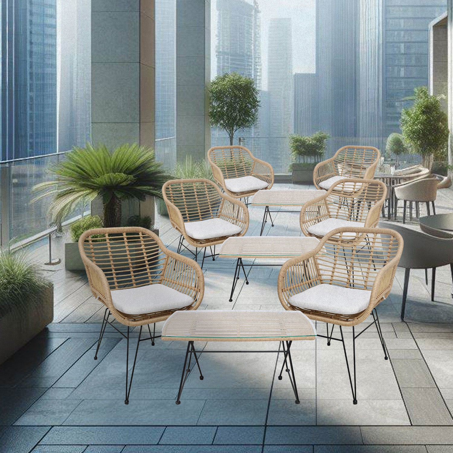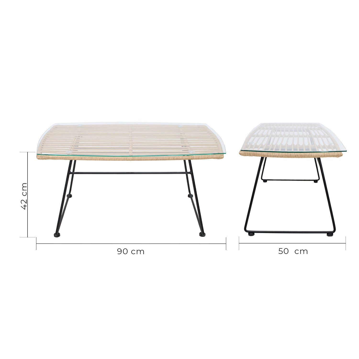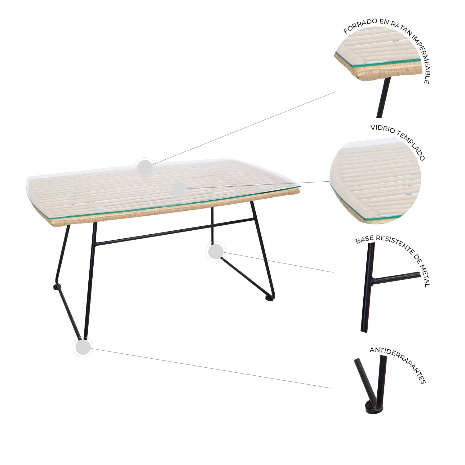 Mesa de exterior con base metálica, antiderrapantes y tejido de rattan sintético impermeable. Incluye cubierta de vidrio templado