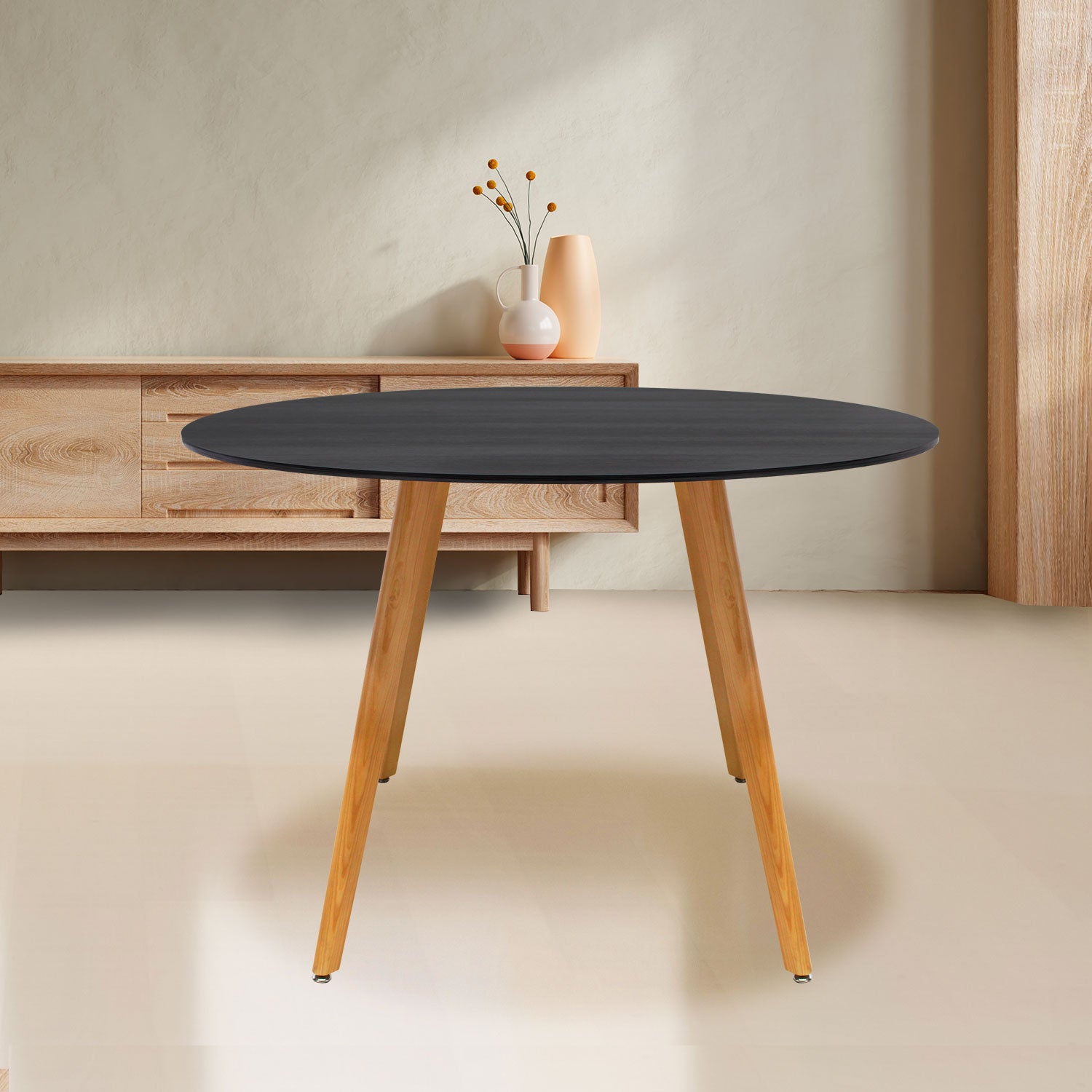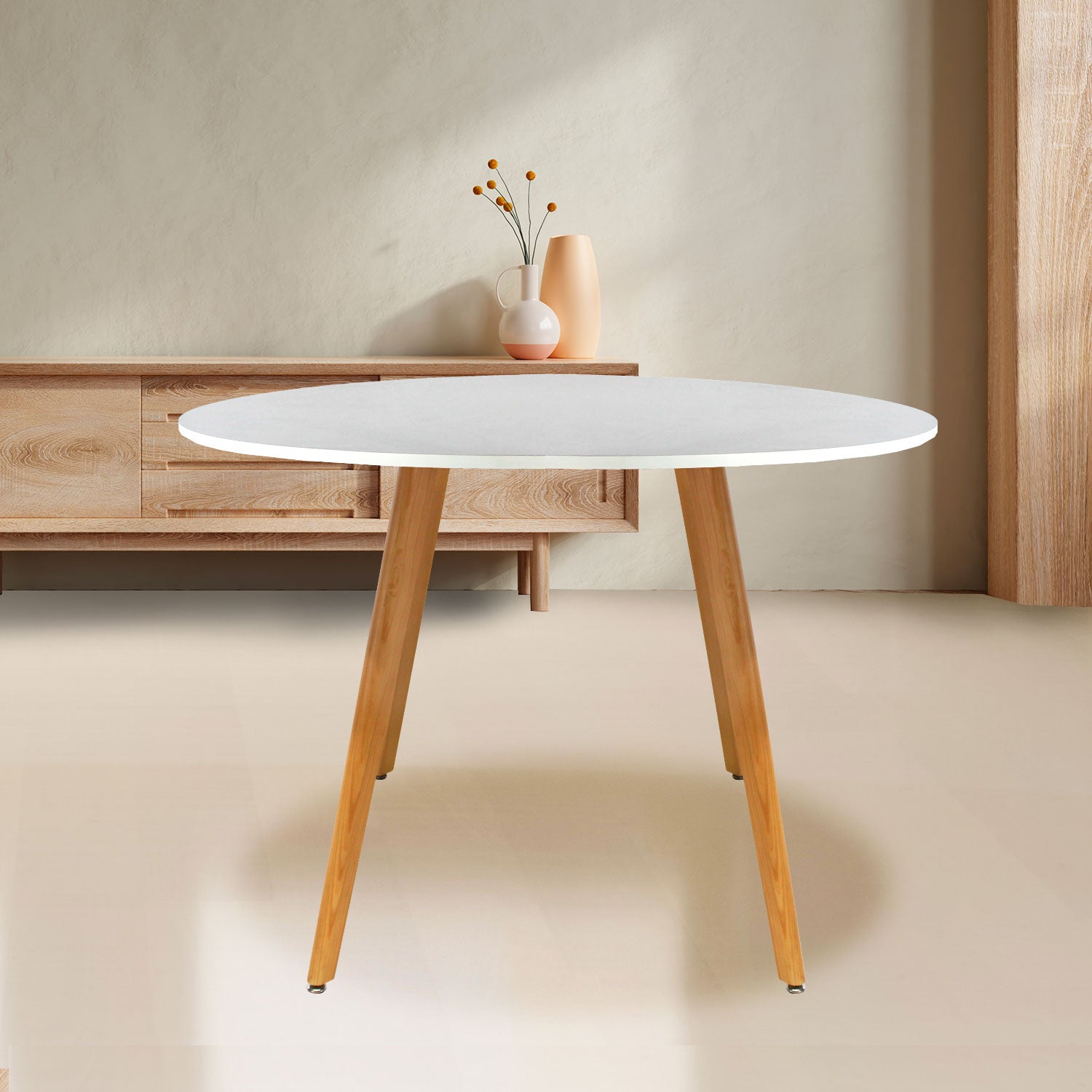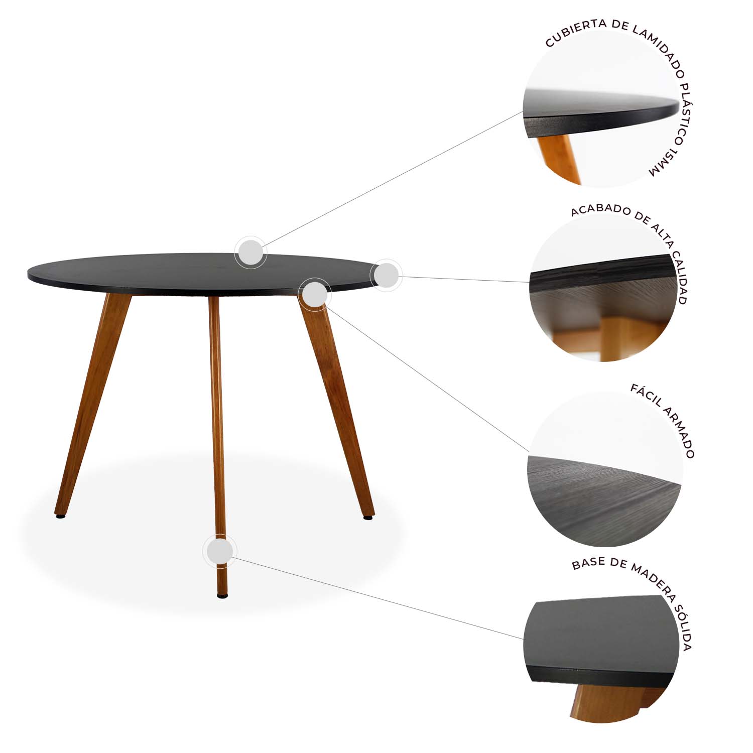 Fabricado en madera, cuenta con una superficie circular, con un soporte de piezas inclinadas
