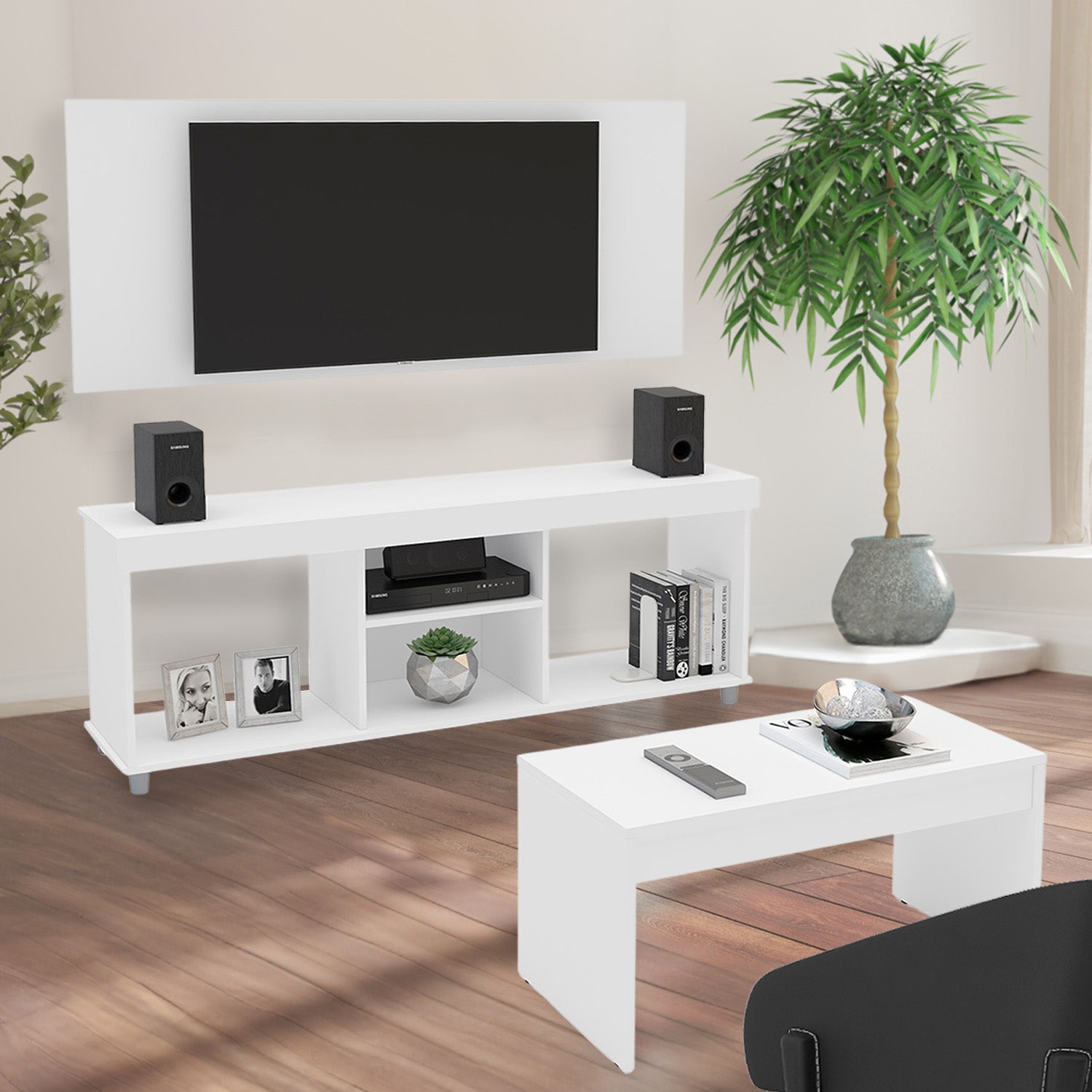 Conjunto fabricado de madera, con tres módulos: Mesa de centro, mueble de tv y cabecera para tv