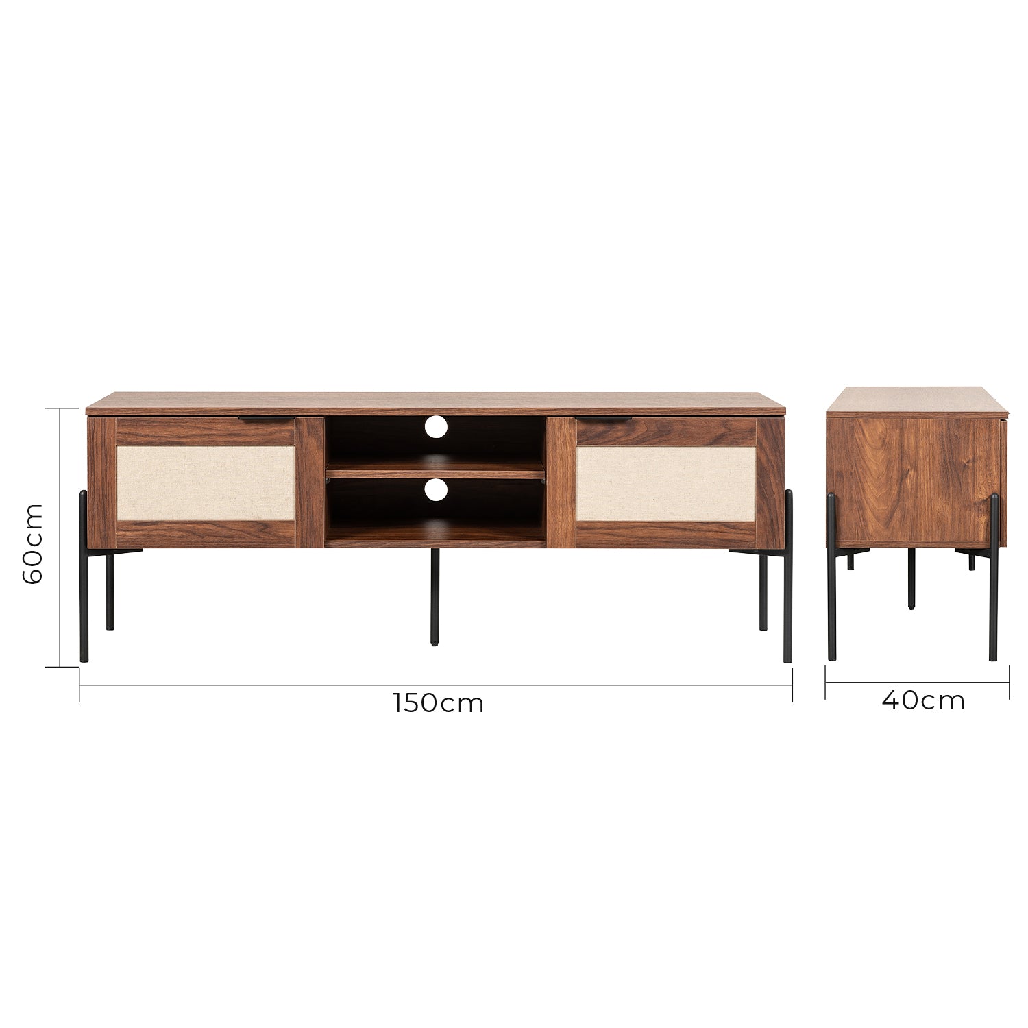 Fabricado en melamina con frentes de marco de melamina y tapiz en tela tipo lino, base metálica. Cuenta con dos puertas abatibles en los extremos y un entrepaño medio con pasacables en el respaldo