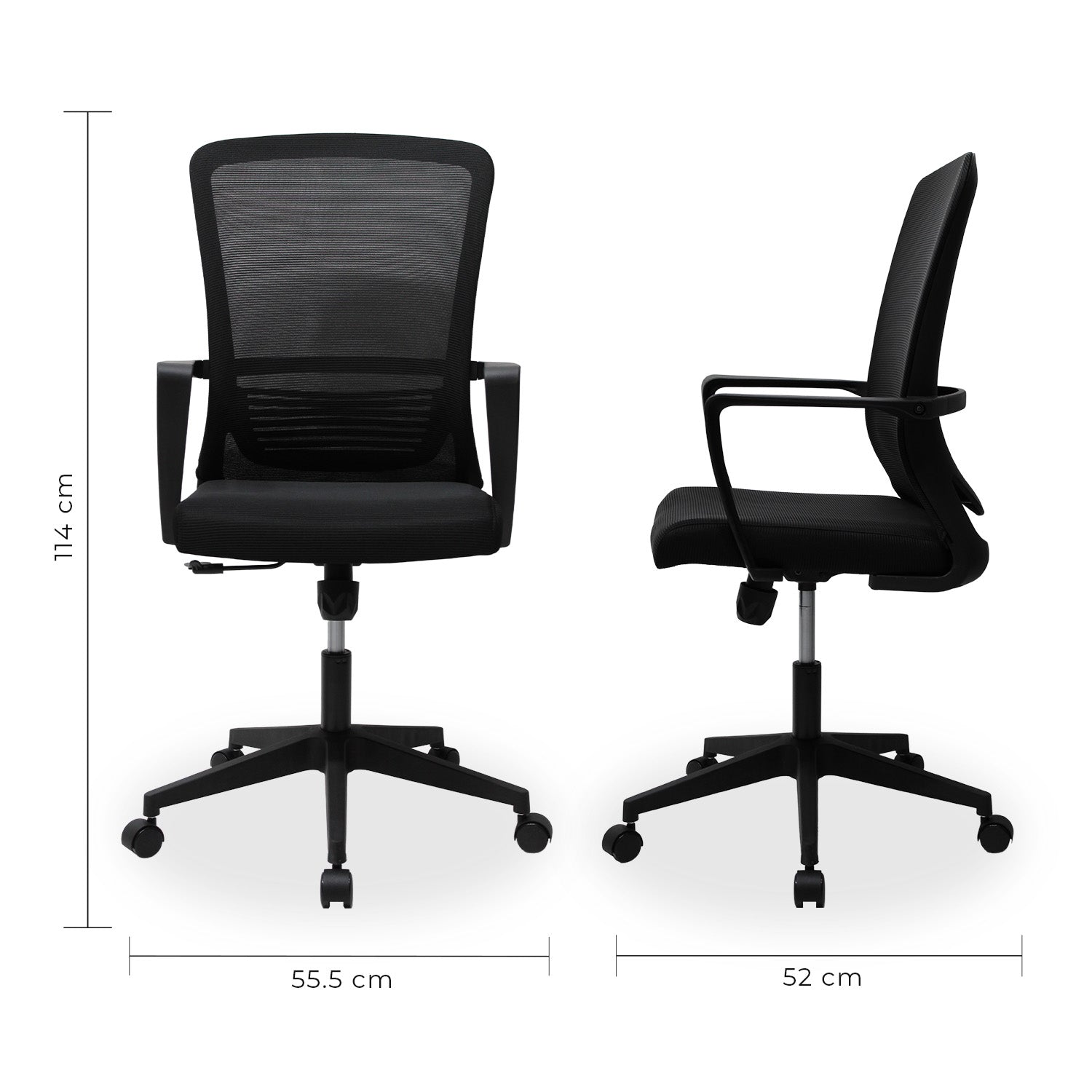 Tapizado de tela tipo "mesh", con una estructura ligera, descansabrazos y base tipo estrella cromada con mecanismo de variación de altura y respaldo reclinable