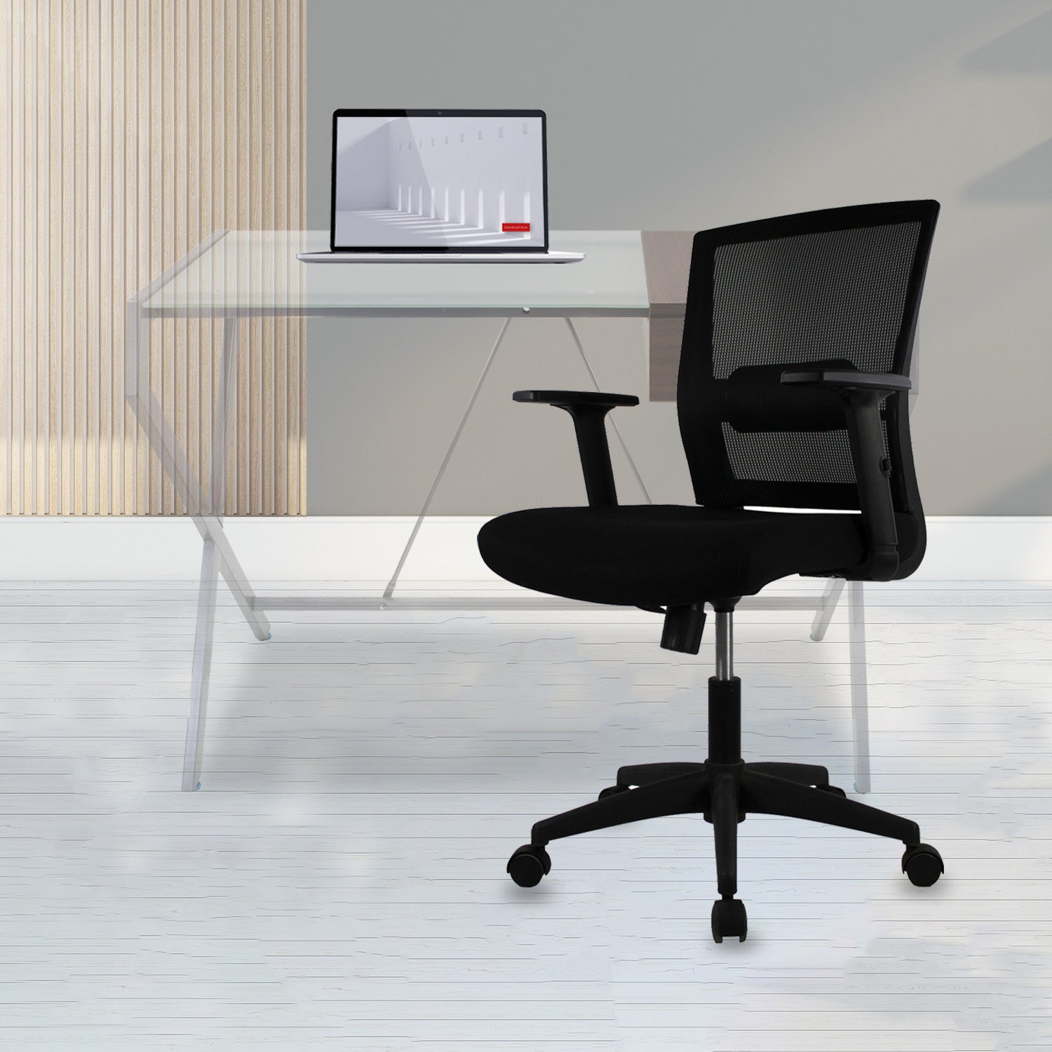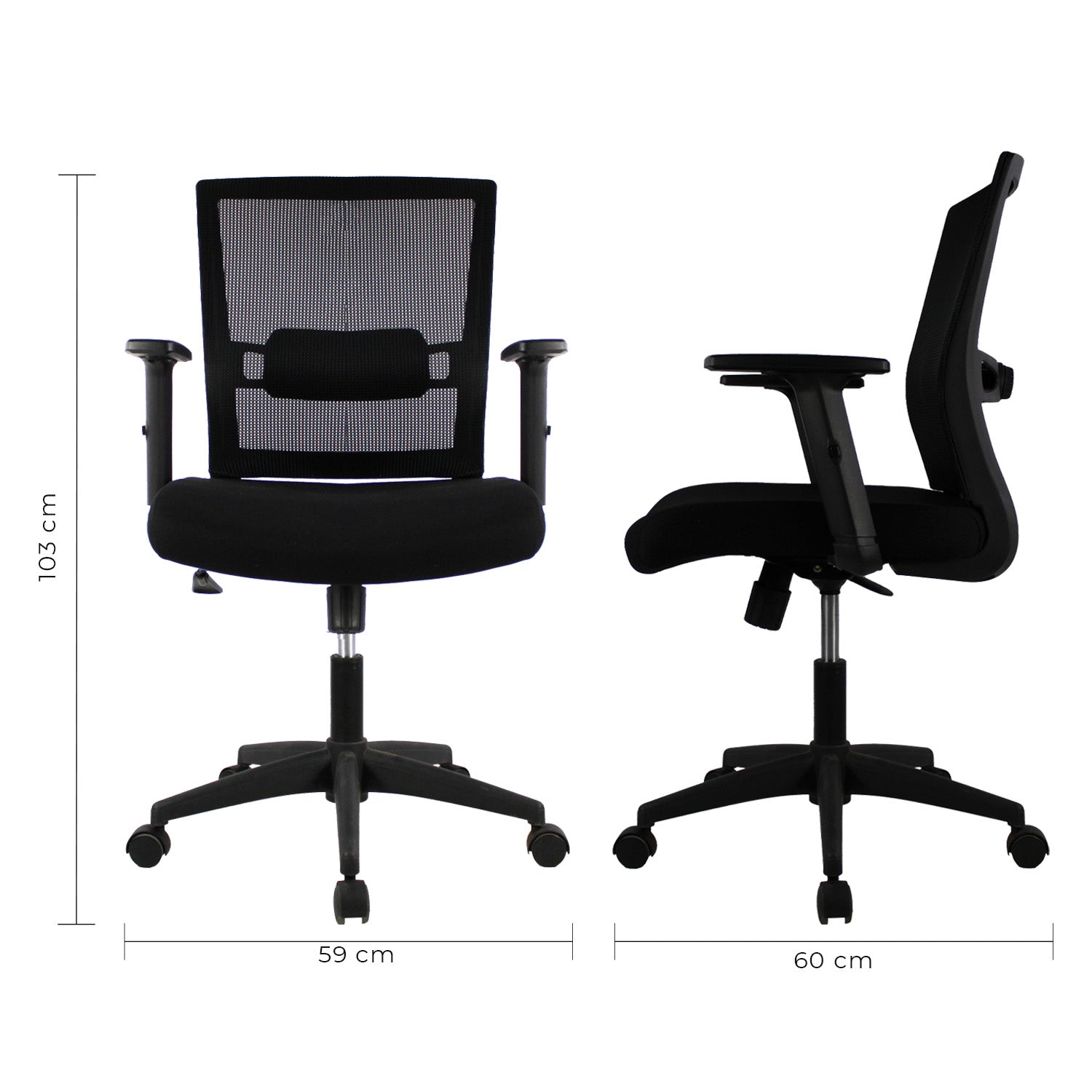 Tapizado de tela tipo "mesh", cuenta con un respaldo con marco plastificado, descansabrazos ajustables, asiento acojinado y base tipo estrella plastificada con mecanismo de variación de altura y respaldo reclinable