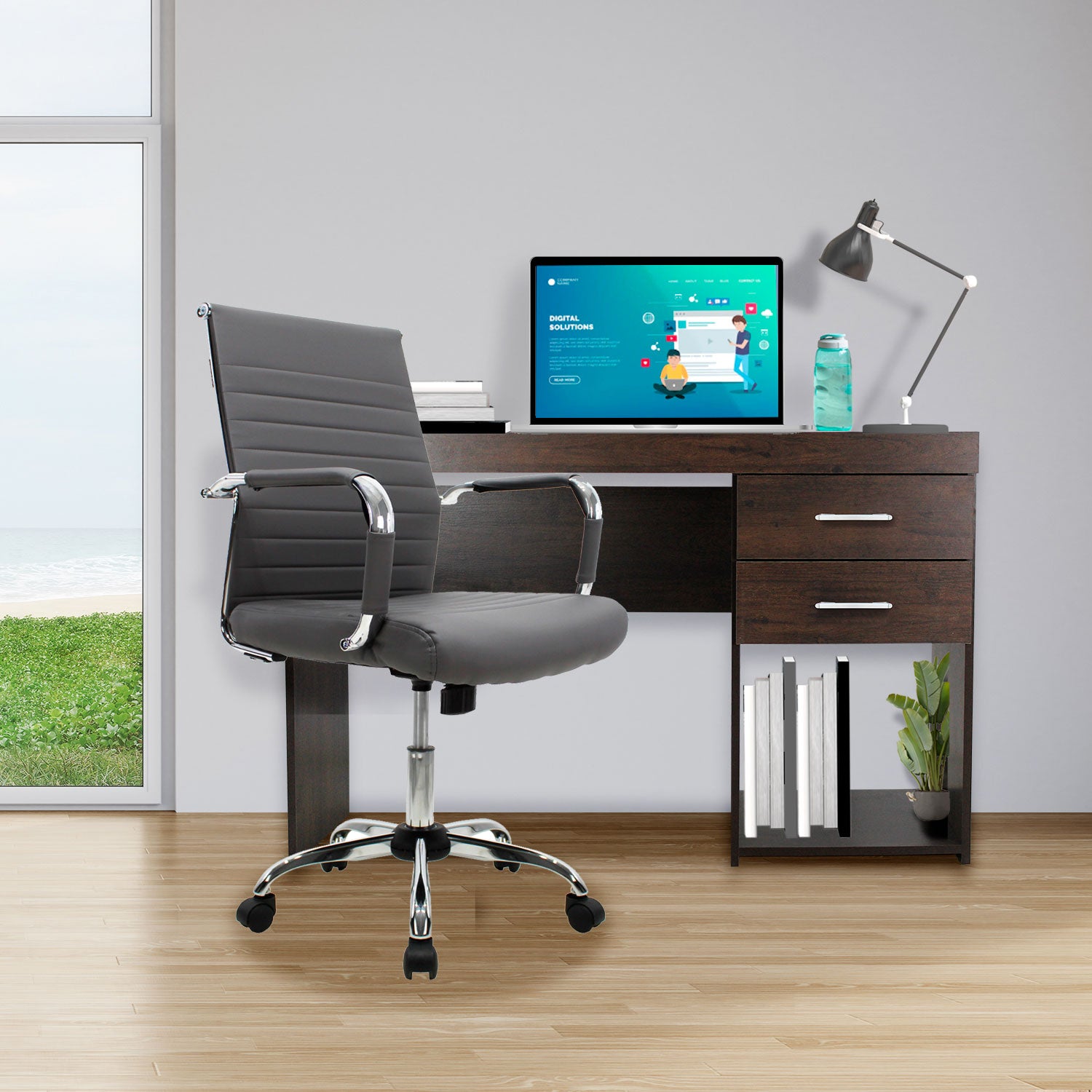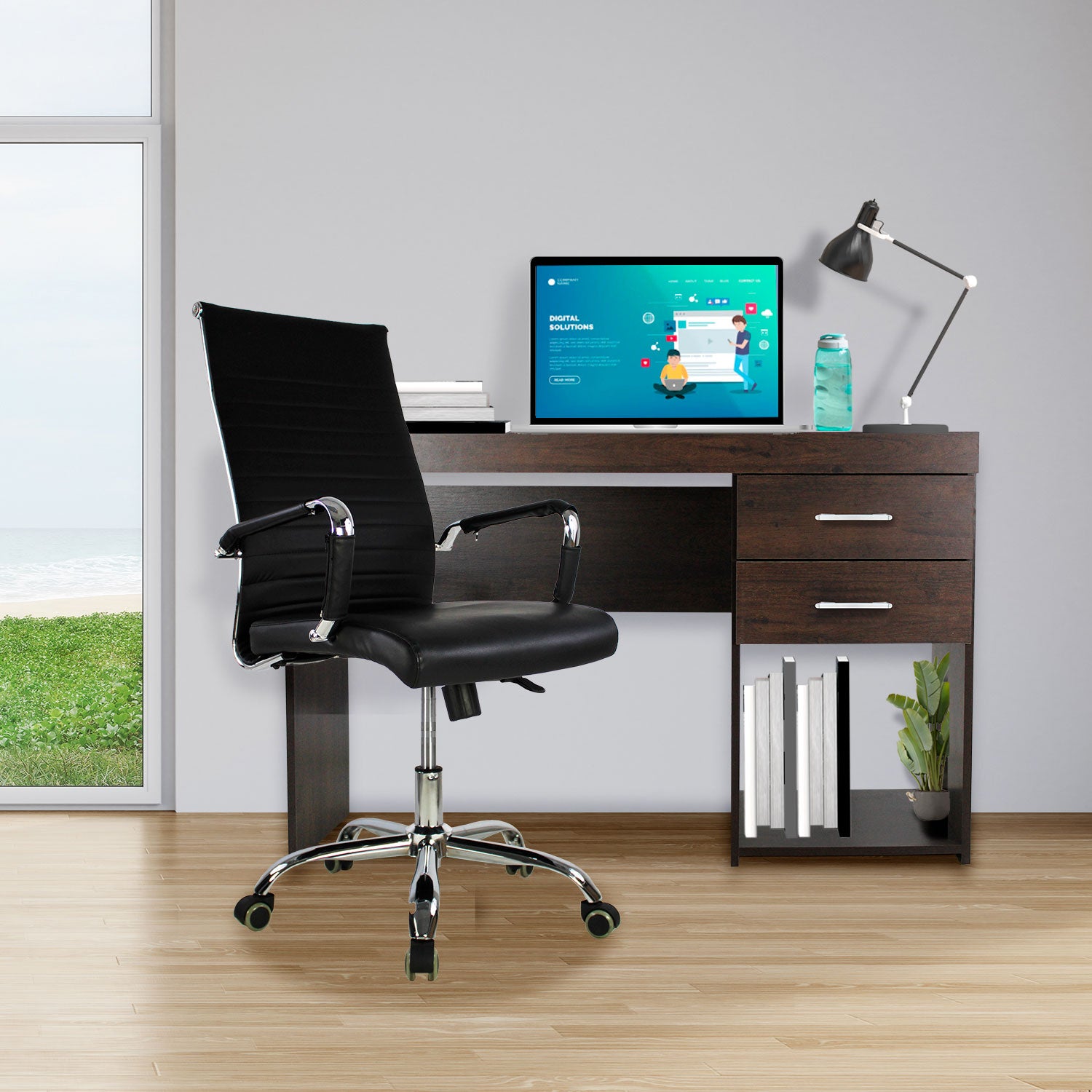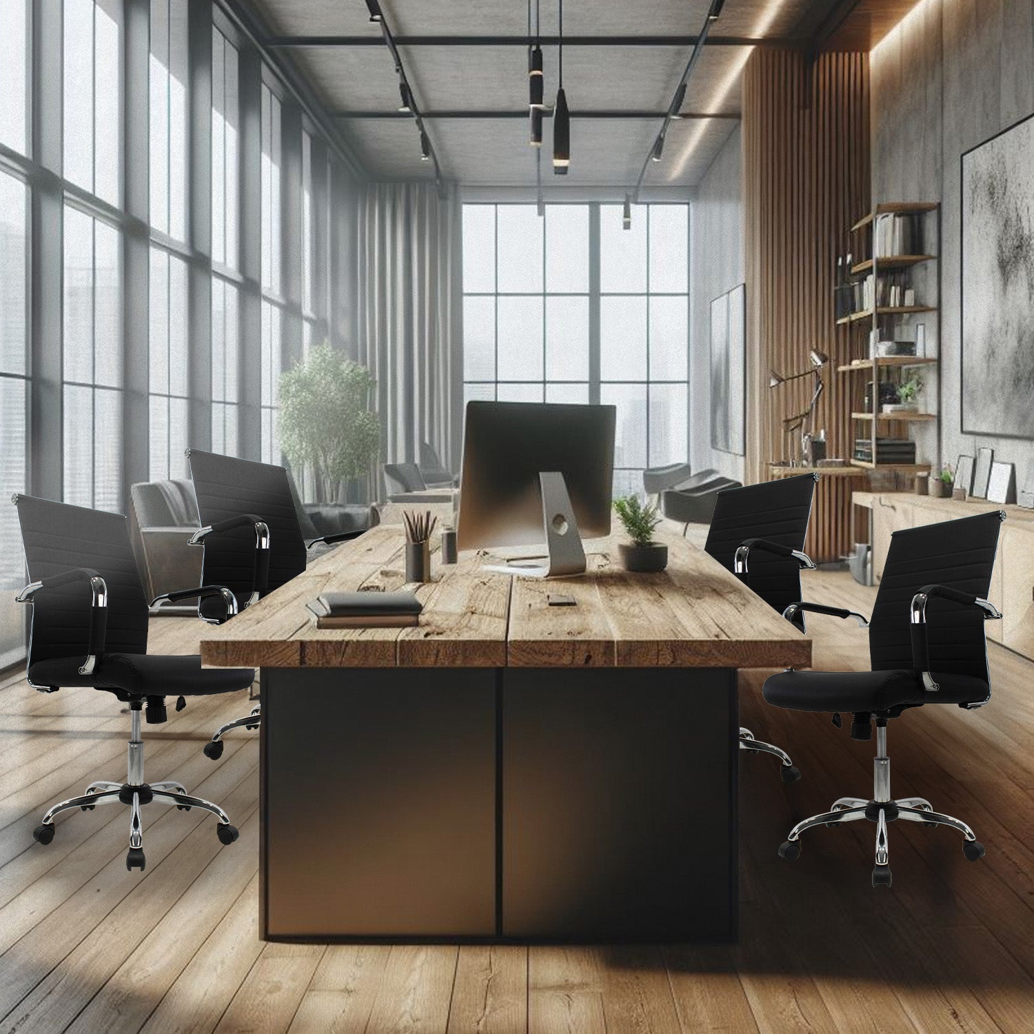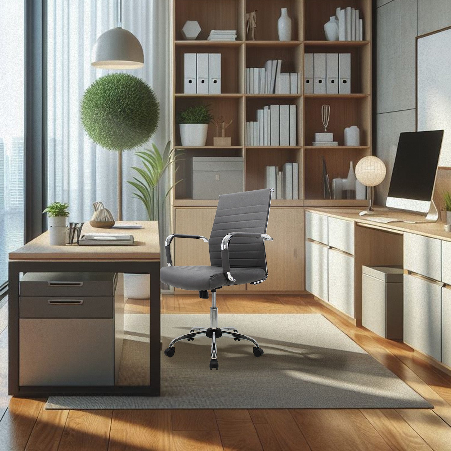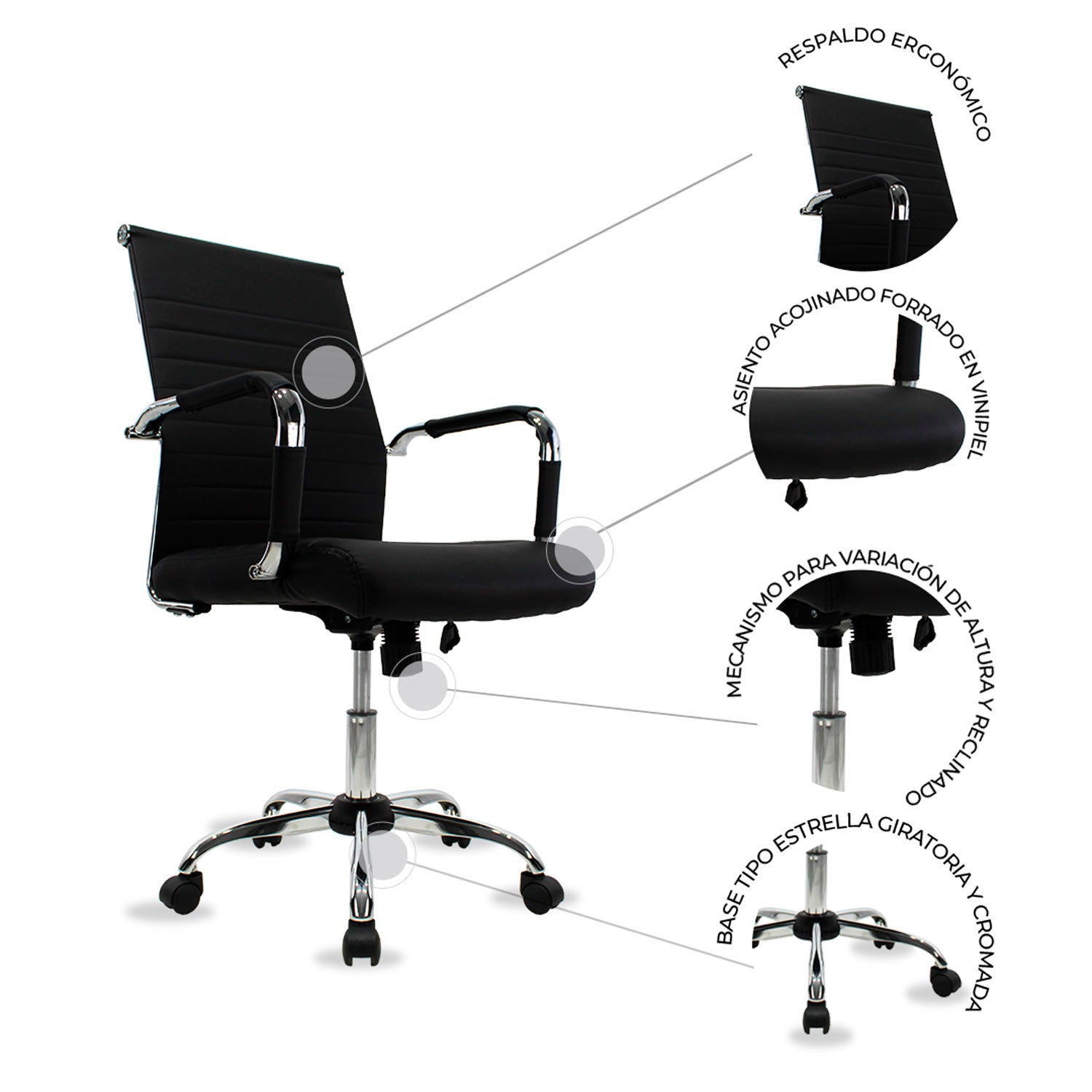 Tapizado en tela tipo PU, cuenta con un alto respaldo con marco metálico cromado, descansabrazos cromados forrados con dos piezas de PU removibles, grueso asiento firme y base tipo estrella cromada, con mecanismo de variación de altura y respaldo reclinable