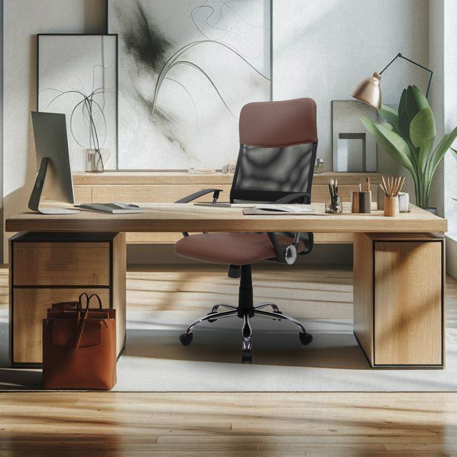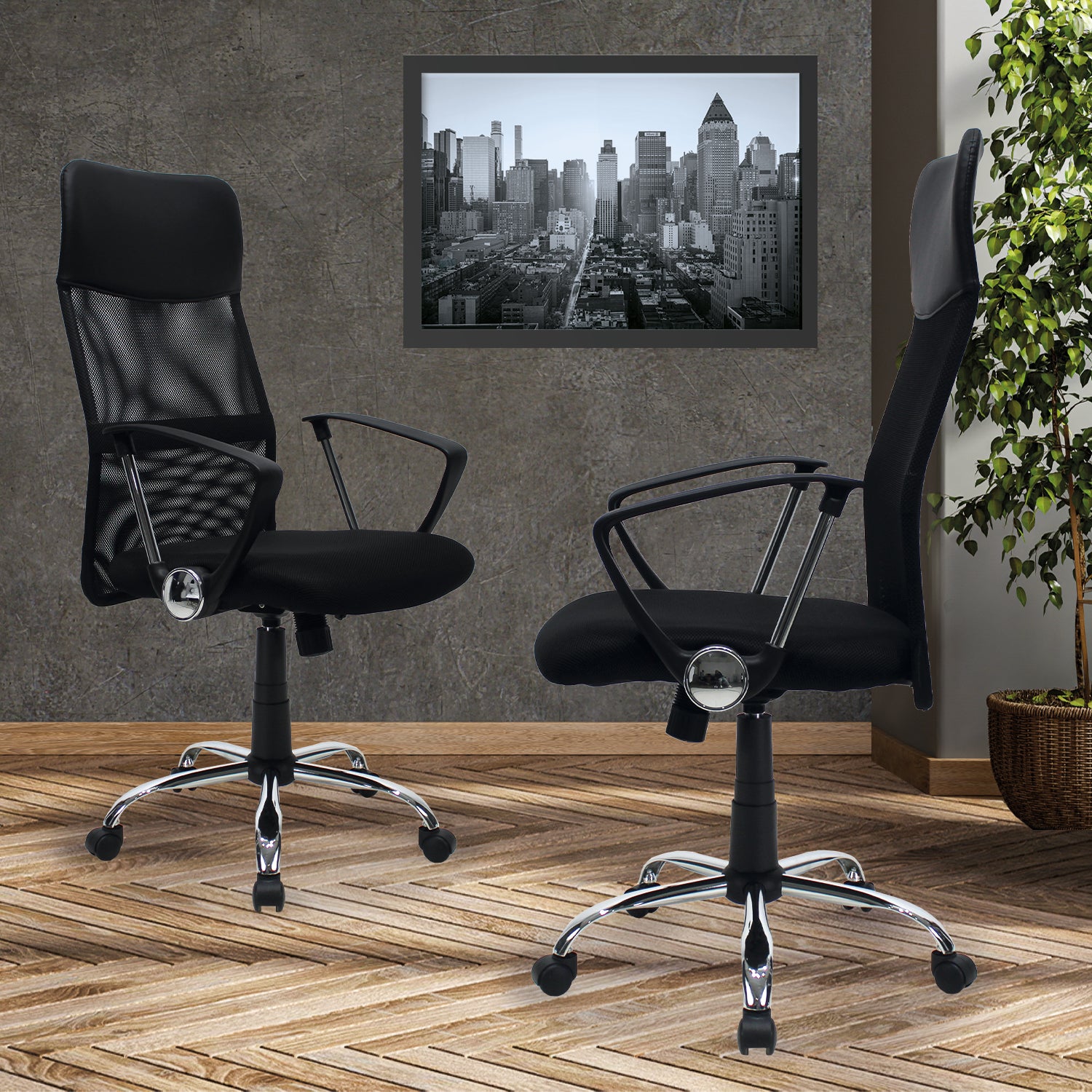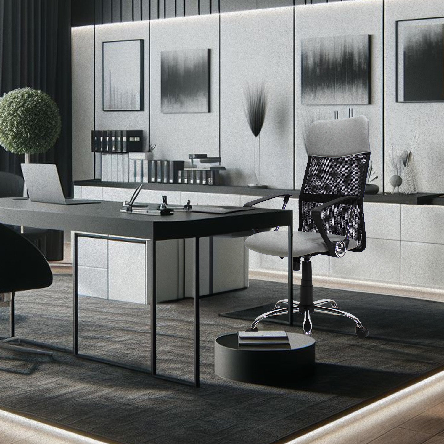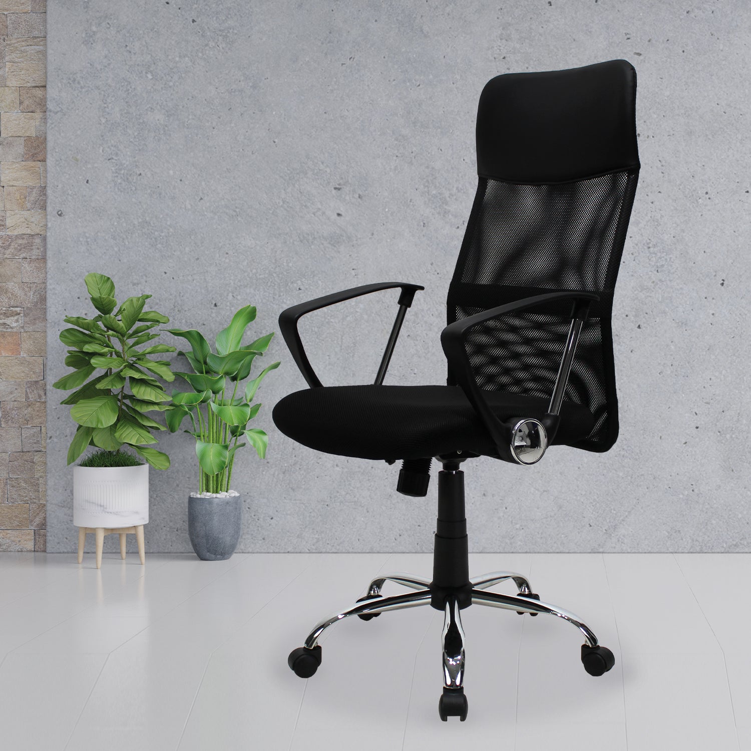 Tapizado de tela tipo "mesh", con una estructura ligera, descansabrazos cromados, respaldo y asiento y base tipo estrella cromada con mecanismo de variación de altura