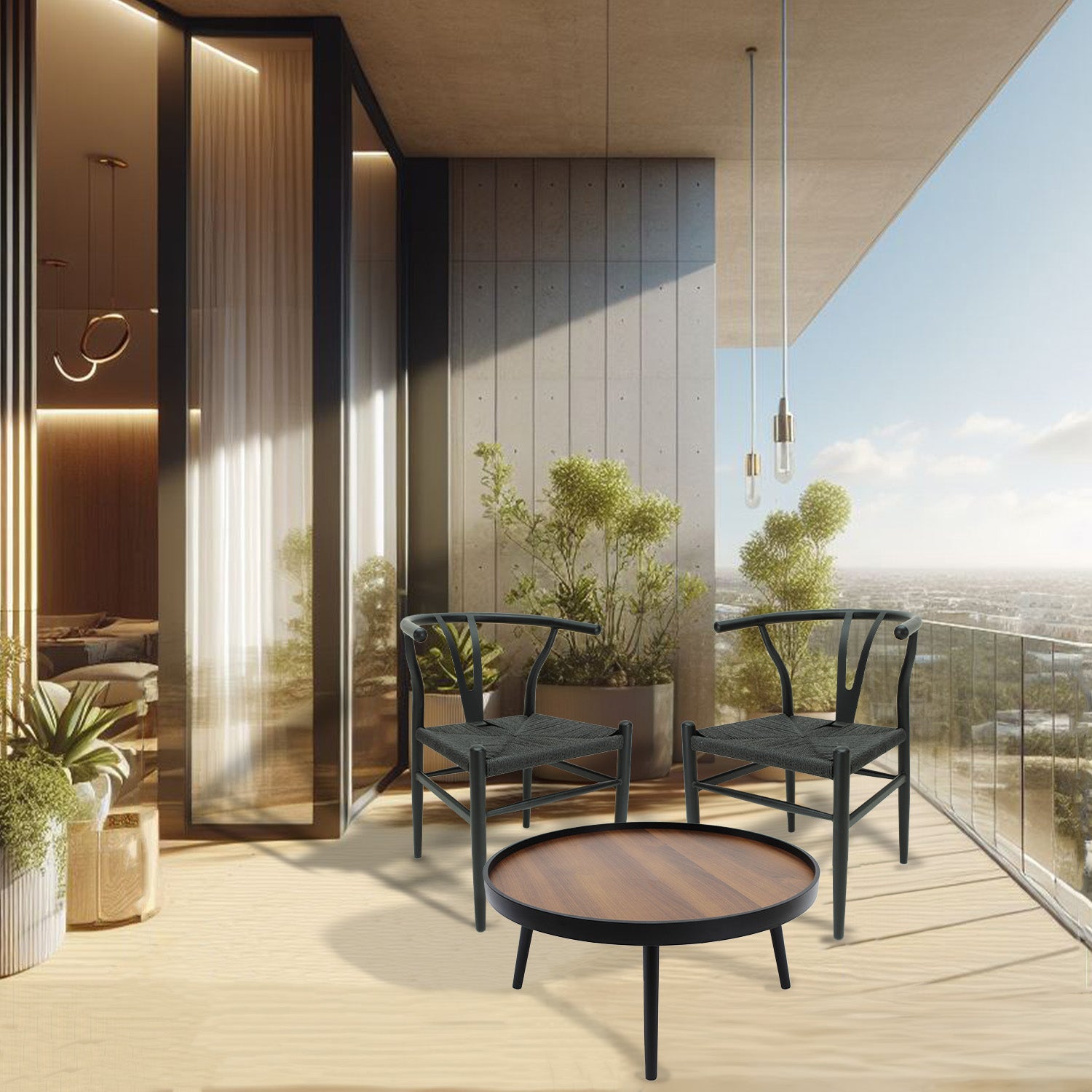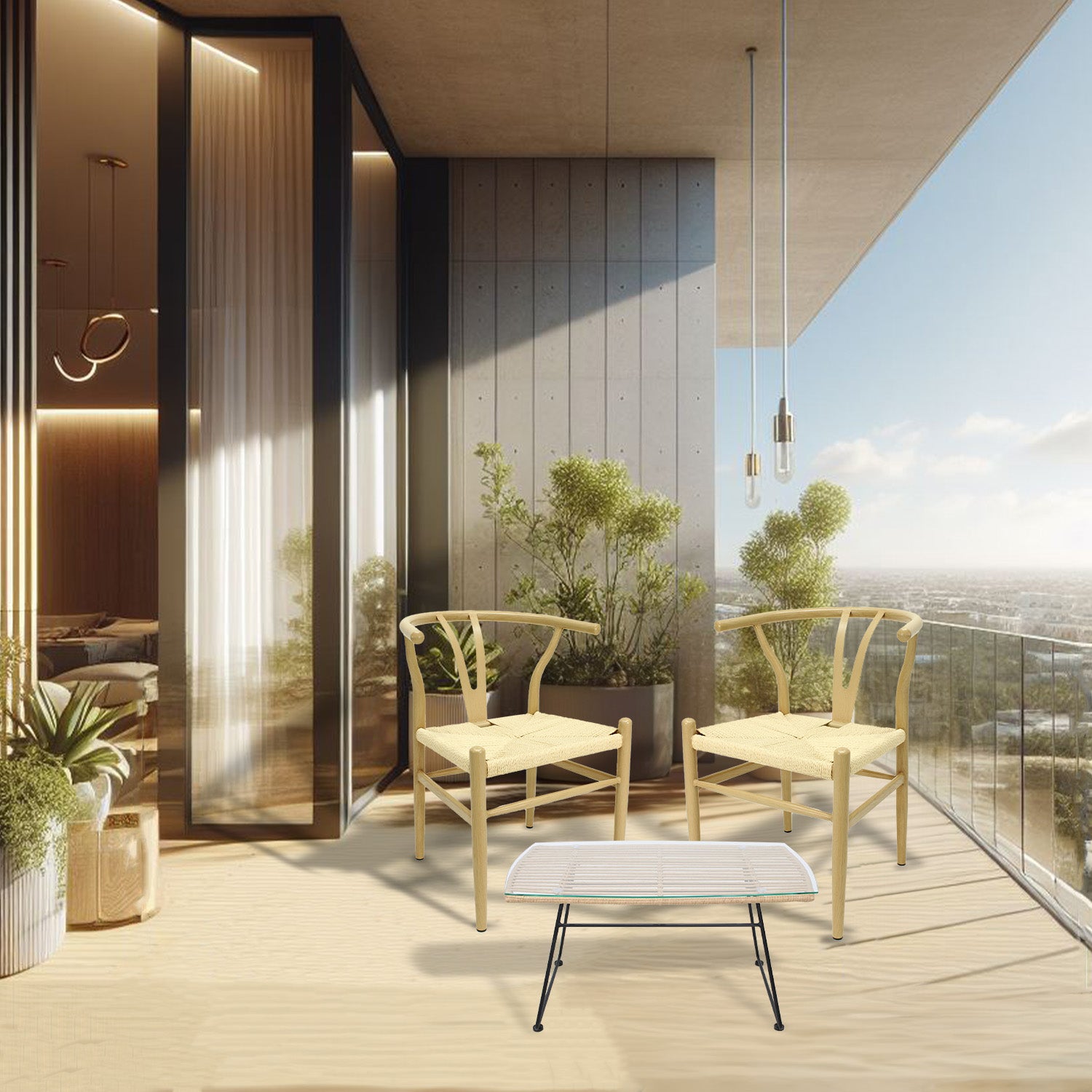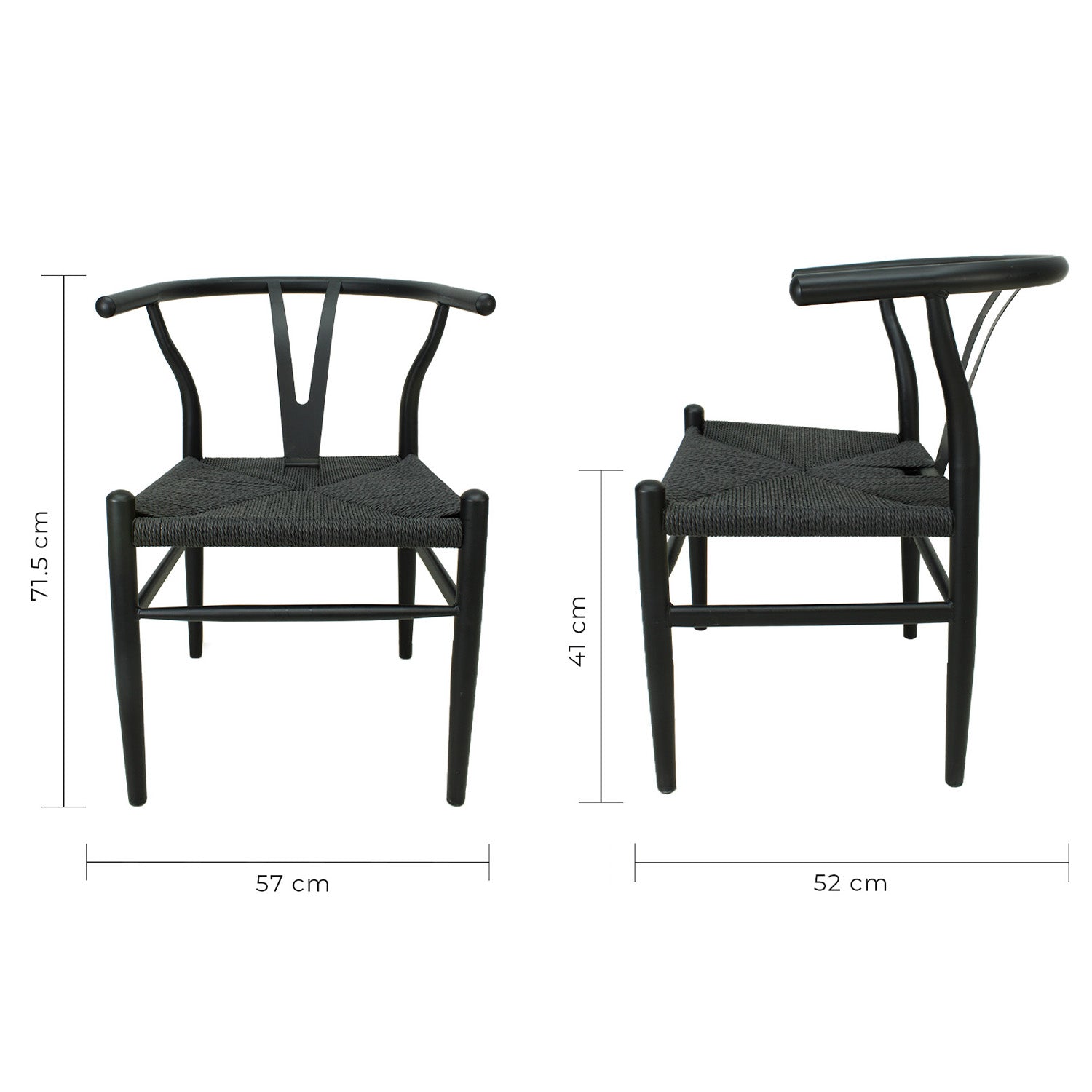 Estructura metálica, cuenta con respaldo curveado, asiento de papel trenzado impermeable y cuatro soportes, estilo escandinavo